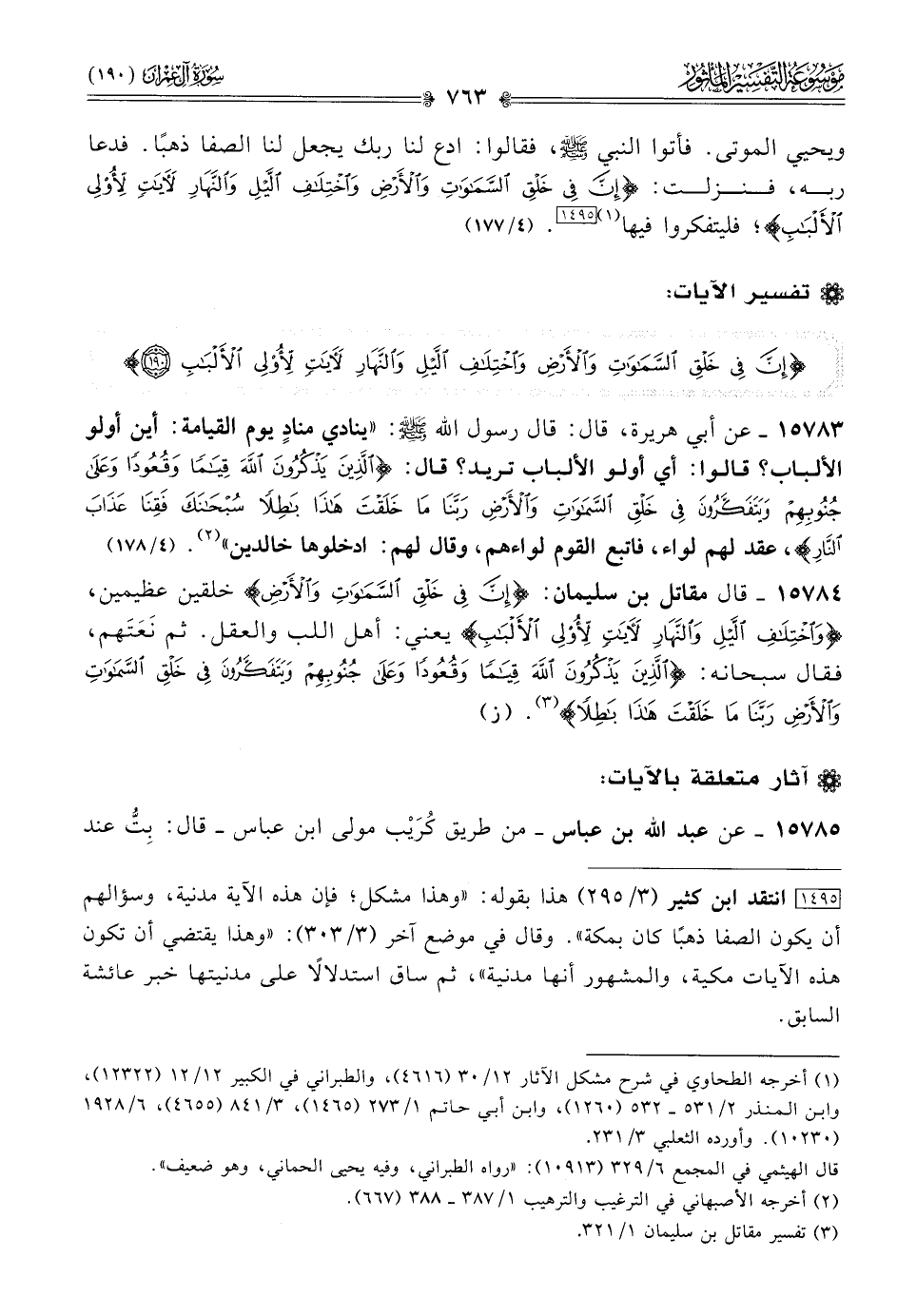 ١٥٧٨٤ - قال مقاتل بن سليمان: {إن في خلق السماوات والأرض} خلقين عظيمين، {واختلاف الليل والنهار لآيات لأولي الألباب} يعني: أهل اللب والعقل. ثم نَعَتَهم، فقال سبحانه: {الذين يذكرون الله قياما وقعودا وعلى جنوبهم ويتفكرون في خلق السماوات والأرض ربنا ما خلقت هذا باطلا} (¬٣). (ز)