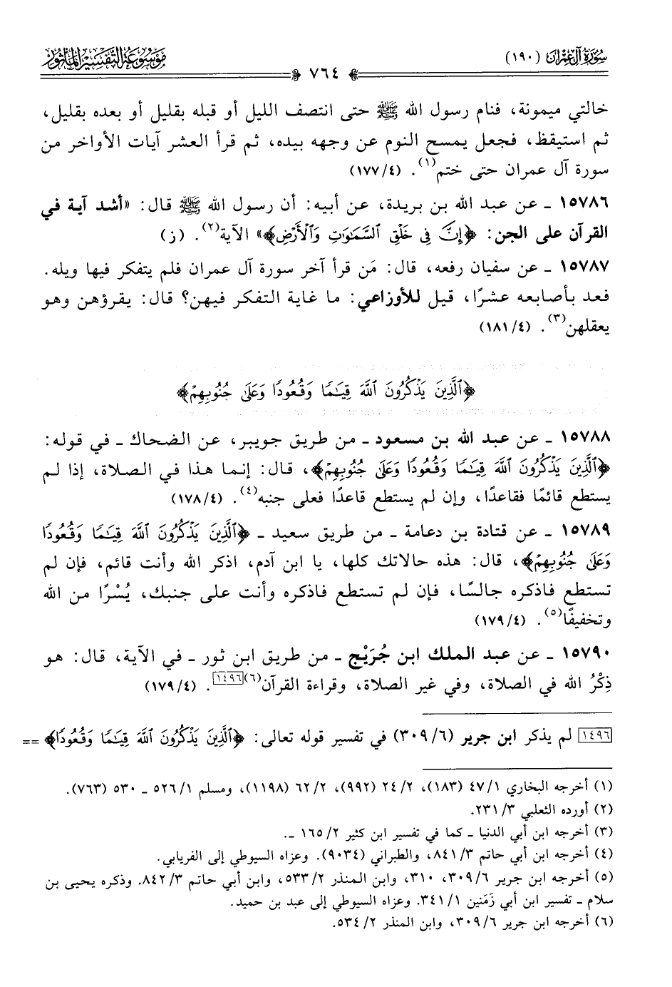 [١٤٩٦] لم يذكر ابن جرير (٦/ ٣٠٩) في تفسير قوله تعالى: {الذين يذكرون الله قياما وقعودًا} سوى أثري ابن جريج وقتادة، وقدَّم لهما بقوله: «ومعنى الآية: إن في خلق السموات والأرض واختلاف الليل والنهار لآيات لأولي الألباب، الذاكرين الله قيامًا وقعودًا وعلى جنوبهم، يعني بذلك: قيامًا في صلاتهم، وقعودًا في تشهدهم وفي غير صلاتهم، وعلى جنوبهم نيامًا».