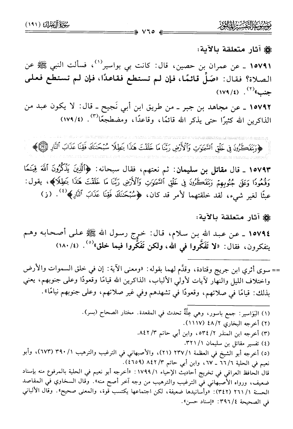 {وَيَتَفَكَّرُونَ فِي خَلْقِ السَّمَاوَاتِ وَالْأَرْضِ رَبَّنَا مَا خَلَقْتَ هَذَا بَاطِلًا سُبْحَانَكَ فَقِنَا عَذَابَ النَّارِ (١٩١)}