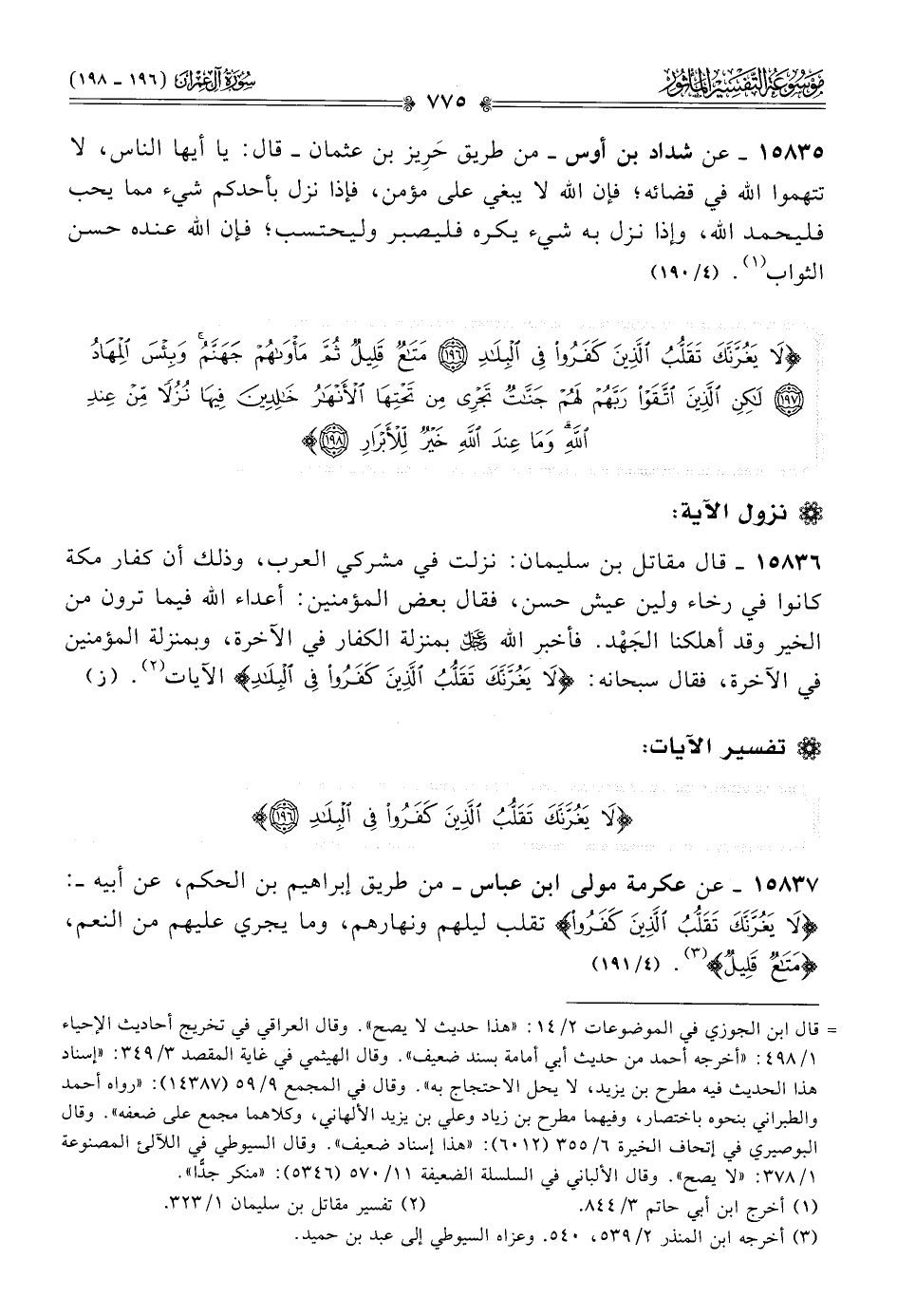 ١٥٨٣٧ - عن عكرمة مولى ابن عباس -من طريق إبراهيم بن الحكم، عن أبيه-: {لا يغرنك تقلب الذين كفروا} تقلب ليلهم ونهارهم، وما يجري عليهم من النعم، {متاع قليل} (¬٣). (٤/ ١٩١)