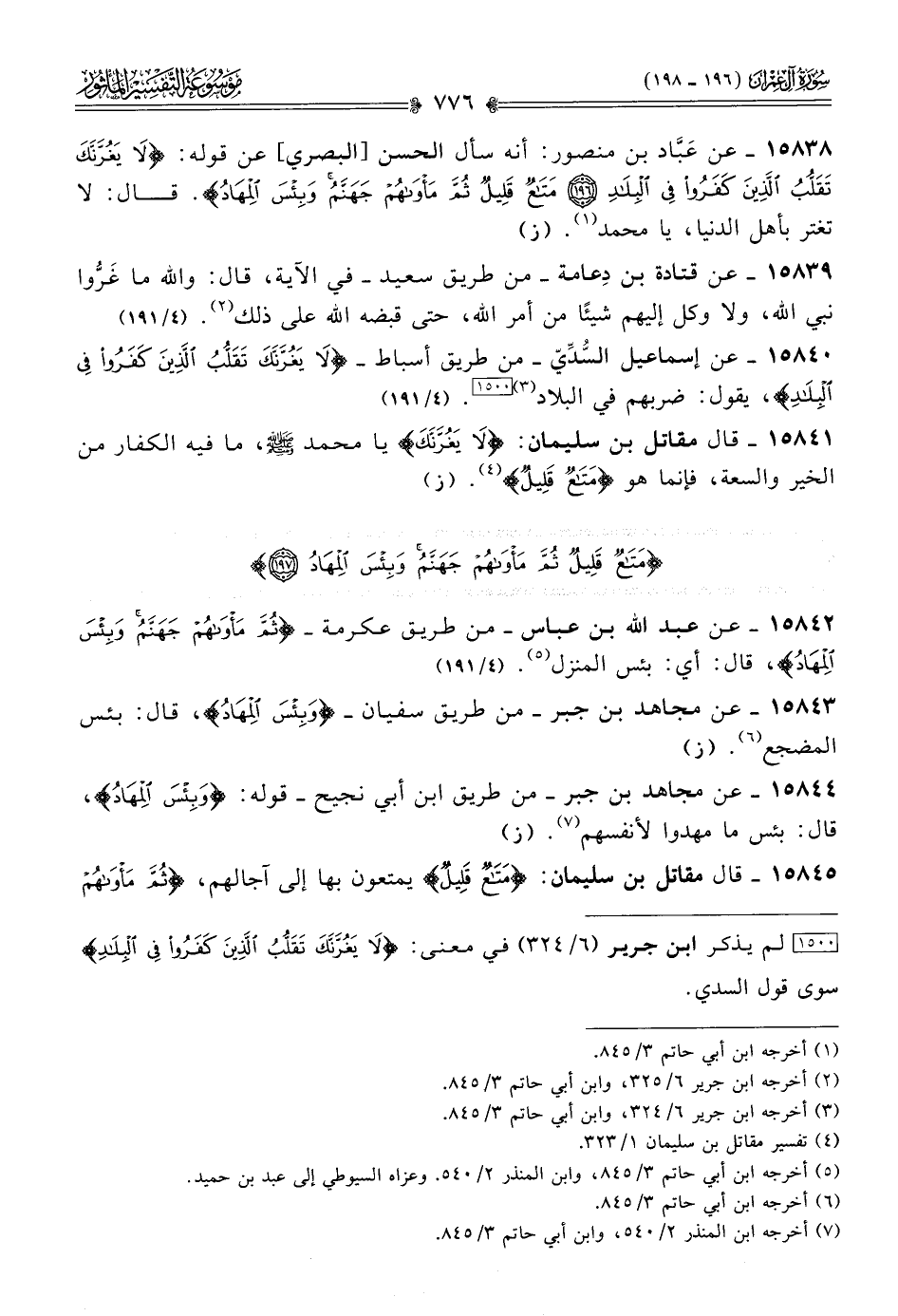 [١٥٠٠] لم يذكر ابن جرير (٦/ ٣٢٤) في معنى: {لا يغُرِّنَّك تقلُّب الذين كفروا في البلاد} سوى قول السدي.