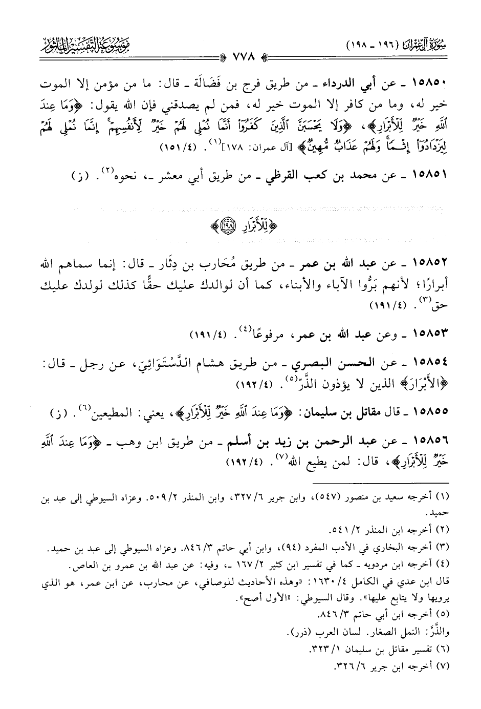 ١٥٨٥٠ - عن أبي الدرداء -من طريق فرج بن فَضالَة- قال: ما من مؤمن إلا الموت خير له، وما من كافر إلا الموت خير له، فمن لم يصدقني فإن الله يقول: {وما عند الله خير للأبرار}، {ولا يحسبن الذين كفروا أنما نملي لهم خير لأنفسهم إنما نملي لهم ليزدادوا إثما ولهم عذاب مهين} [آل عمران: ١٧٨] (¬١). (٤/ ١٥١)