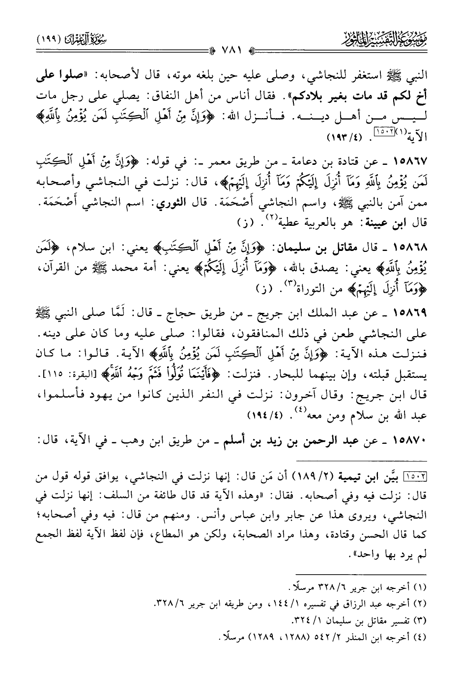 [١٥٠٢] بيَّن ابن تيمية (٢/ ١٨٩) أن مَن قال: إنها نزلت في النجاشي، يوافق قوله قول من قال: نزلت فيه وفي أصحابه. فقال: «وهذه الآية قد قال طائفة من السلف: إنها نزلت في النجاشي، ويروى هذا عن جابر وابن عباس وأنس. ومنهم من قال: فيه وفي أصحابه؛ كما قال الحسن وقتادة، وهذا مراد الصحابة، ولكن هو المطاع، فإن لفظ الآية لفظ الجمع لم يرد بها واحد».