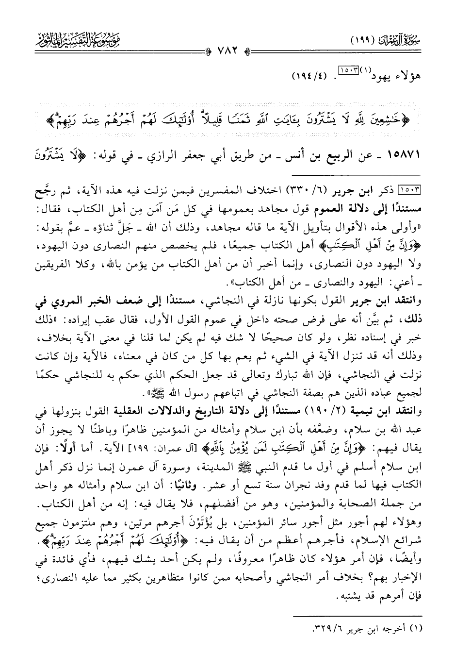 [١٥٠٣] ذكر ابن جرير (٦/ ٣٣٠) اختلاف المفسرين فيمن نزلت فيه هذه الآية، ثم رجَّح مستندًا إلى دلالة العموم قول مجاهد بعمومها في كل مَن آمَن مِن أهل الكتاب، فقال: «وأولى هذه الأقوال بتأويل الآية ما قاله مجاهد، وذلك أن الله -جَلَّ ثناؤه- عمَّ بقوله: {وإن من أهل الكتاب} أهل الكتاب جميعًا، فلم يخصص منهم النصارى دون اليهود، ولا اليهود دون النصارى، وإنما أخبر أن من أهل الكتاب من يؤمن بالله، وكلا الفريقين -أعني: اليهود والنصارى- من أهل الكتاب».وانتقد ابن جرير القول بكونها نازلة في النجاشي، مستندًا إلى ضعف الخبر المروي في ذلك، ثم بين أنه على فرض صحته داخل في عموم القول الأول، فقال عقب إيراده: «ذلك خبر في إسناده نظر، ولو كان صحيحًا لا شك فيه لم يكن لما قلنا في معنى الآية بخلاف، وذلك أنه قد تنزل الآية في الشيء ثم يعم بها كل من كان في معناه، فالآية وإن كانت نزلت في النجاشي، فإن الله تبارك وتعالى قد جعل الحكم الذي حكم به للنجاشي حكمًا لجميع عباده الذين هم بصفة النجاشي في اتباعهم رسول الله - صلى الله عليه وسلم -».وانتقد ابن تيمية (٢/ ١٩٠) مستندًا إلى دلالة التاريخ والدلالات العقلية القول بنزولها في عبد الله بن سلام، وضعَّفه بأن ابن سلام وأمثاله من المؤمنين ظاهرًا وباطنًا لا يجوز أن يقال فيهم: {وإنَّ مِن أهْلِ الكِتابِ لَمَن يُؤْمِنُ بِاللهِ} [آل عمران: ١٩٩] الآية. أما أولًا: فإن ابن سلام أسلم في أول ما قدم النبي - صلى الله عليه وسلم - المدينة، وسورة آل عمرن إنما نزل ذكر أهل الكتاب فيها لما قدم وفد نجران سنة تسع أو عشر. وثانيًا: أن ابن سلام وأمثاله هو واحد من جملة الصحابة والمؤمنين، وهو من أفضلهم، فلا يقال فيه: إنه من أهل الكتاب. وهؤلاء لهم أجور مثل أجور سائر المؤمنين، بل يُؤْتَوْنَ أجرهم مرتين، وهم ملتزمون جميع شرائع الإسلام، فأجرهم أعظم من أن يقال فيه: {أُولَئِكَ لَهُمْ أجْرُهُمْ عِندَ رَبِّهِمْ}. وأيضًا، فإن أمر هؤلاء كان ظاهرًا معروفًا، ولم يكن أحد يشك فيهم، فأي فائدة في الإخبار بهم؟ بخلاف أمر النجاشي وأصحابه ممن كانوا متظاهرين بكثير مما عليه النصارى؛ فإن أمرهم قد يشتبه.