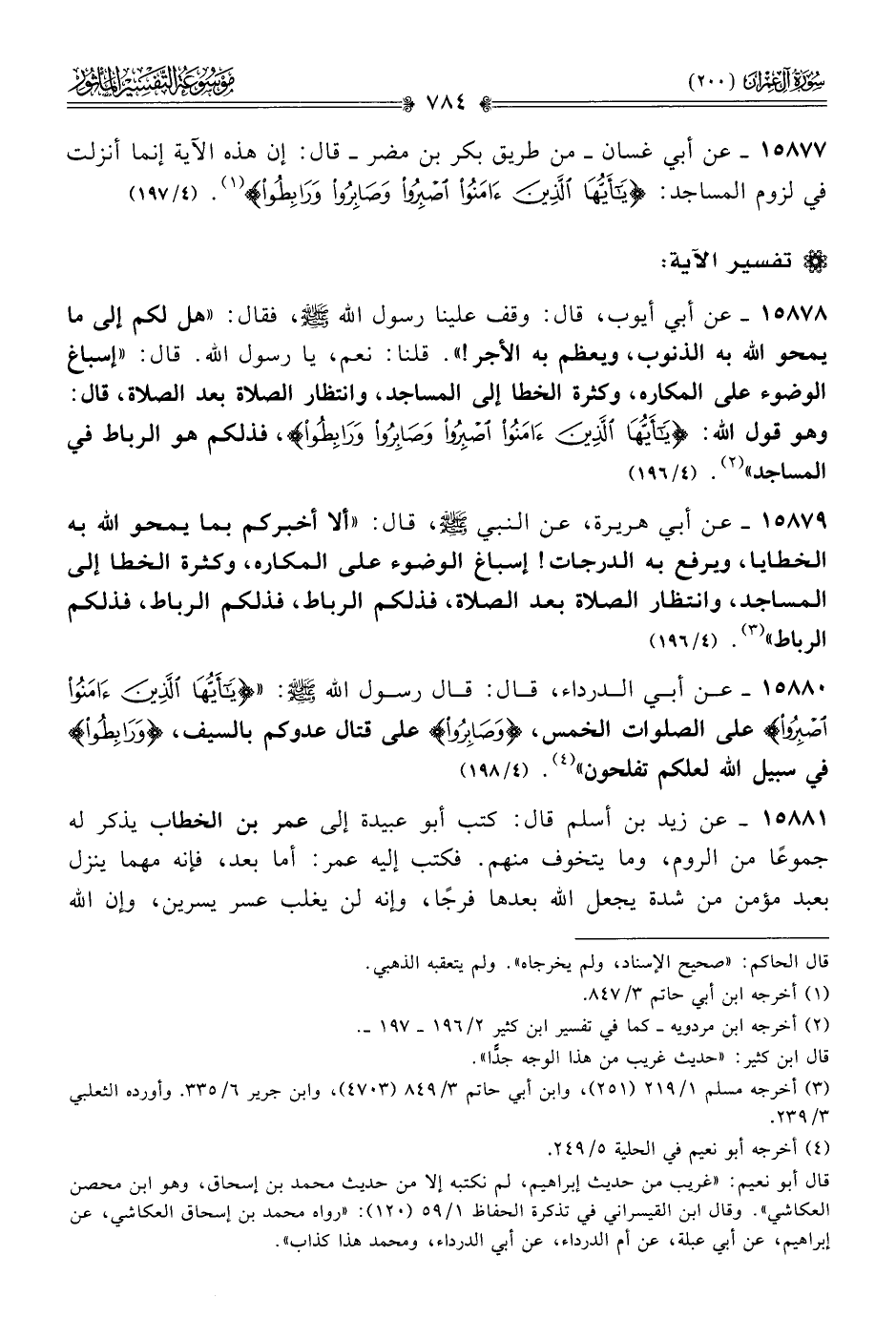 ١٥٨٨٠ - عن أبي الدرداء، قال: قال رسول الله - صلى الله عليه وسلم -: «{يا أيها الذين آمنوا اصبروا} على الصلوات الخمس، {وصابروا} على قتال عدوكم بالسيف، {ورابطوا} في سبيل الله لعلكم تفلحون» (¬٤). (٤/ ١٩٨)