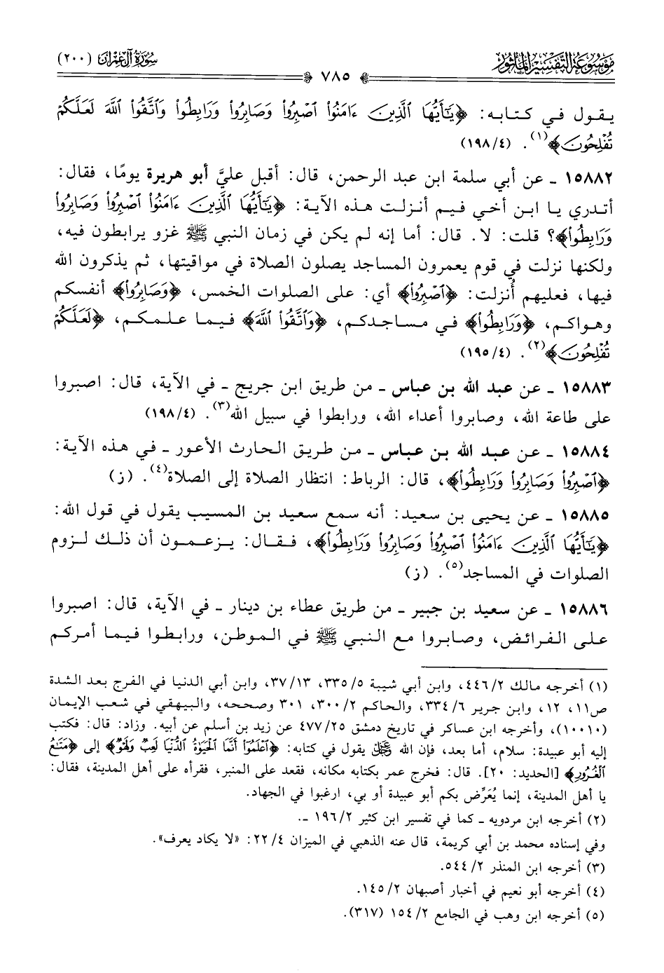 ١٥٨٨٥ - عن يحيى بن سعيد: أنه سمع سعيد بن المسيب يقول في قول الله: {يا أيها الذين آمنوا اصبروا وصابروا ورابطوا}، فقال: يزعمون أن ذلك لزوم الصلوات في المساجد (¬٥). (ز)