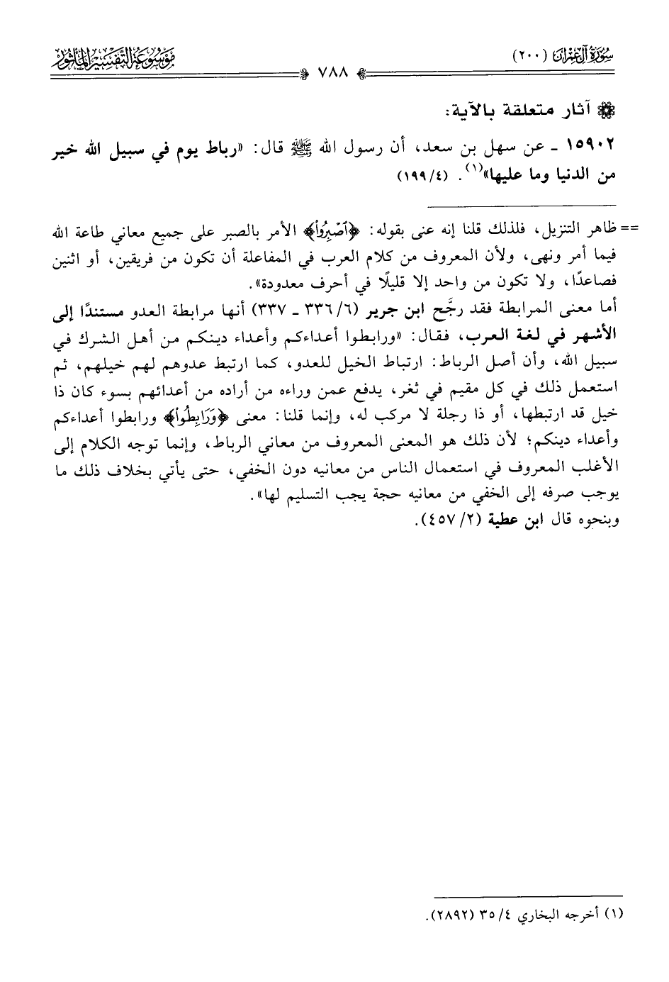١٥٩٠٢ - عن سهل بن سعد، أن رسول الله - صلى الله عليه وسلم - قال: «رباط يوم في سبيل الله خير من الدنيا وما عليها» (¬١). (٤/ ١٩٤)