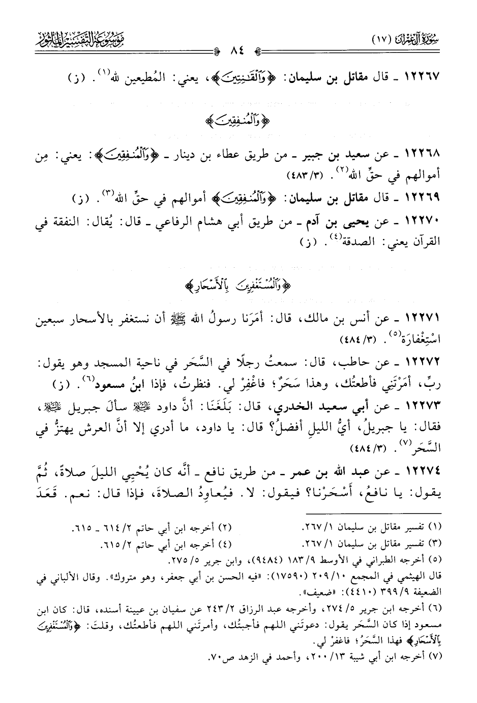 (¬٦) أخرجه ابن جرير ٥/ ٢٧٤، وأخرجه عبد الرزاق ٢/ ٢٤٣ عن سفيان بن عيينة أسنده، قال: كان ابن مسعود إذا كان السَّحَر يقول: دعوتَني اللهم فأجبتُك، وأمرتَني اللهم فأطعتُك، وقلتَ: {والمُسْتَغْفِرِينَ بِالأَسْحارِ} فهذا السَّحَرُ؛ فاغفرْ لي.