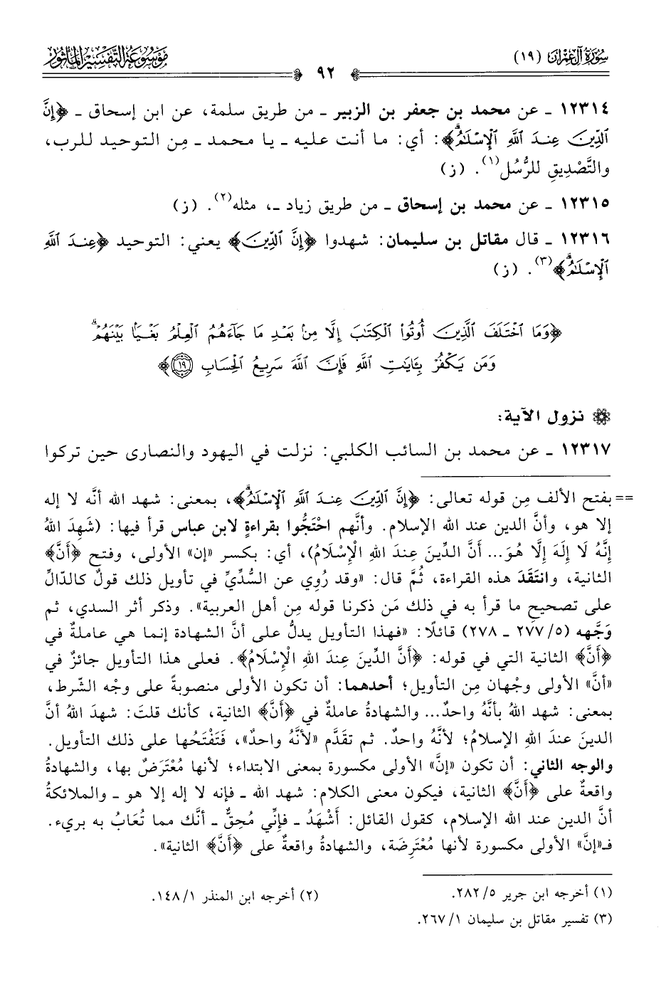 ١٢٣١٤ - عن محمد بن جعفر بن الزبير -من طريق سلمة، عن ابن إسحاق- {إن الدين عند الله الإسلام}: أي: ما أنت عليه -يا محمد- مِن التوحيد للرب، والتَّصْدِيقِ للرُّسُل (¬١). (ز)