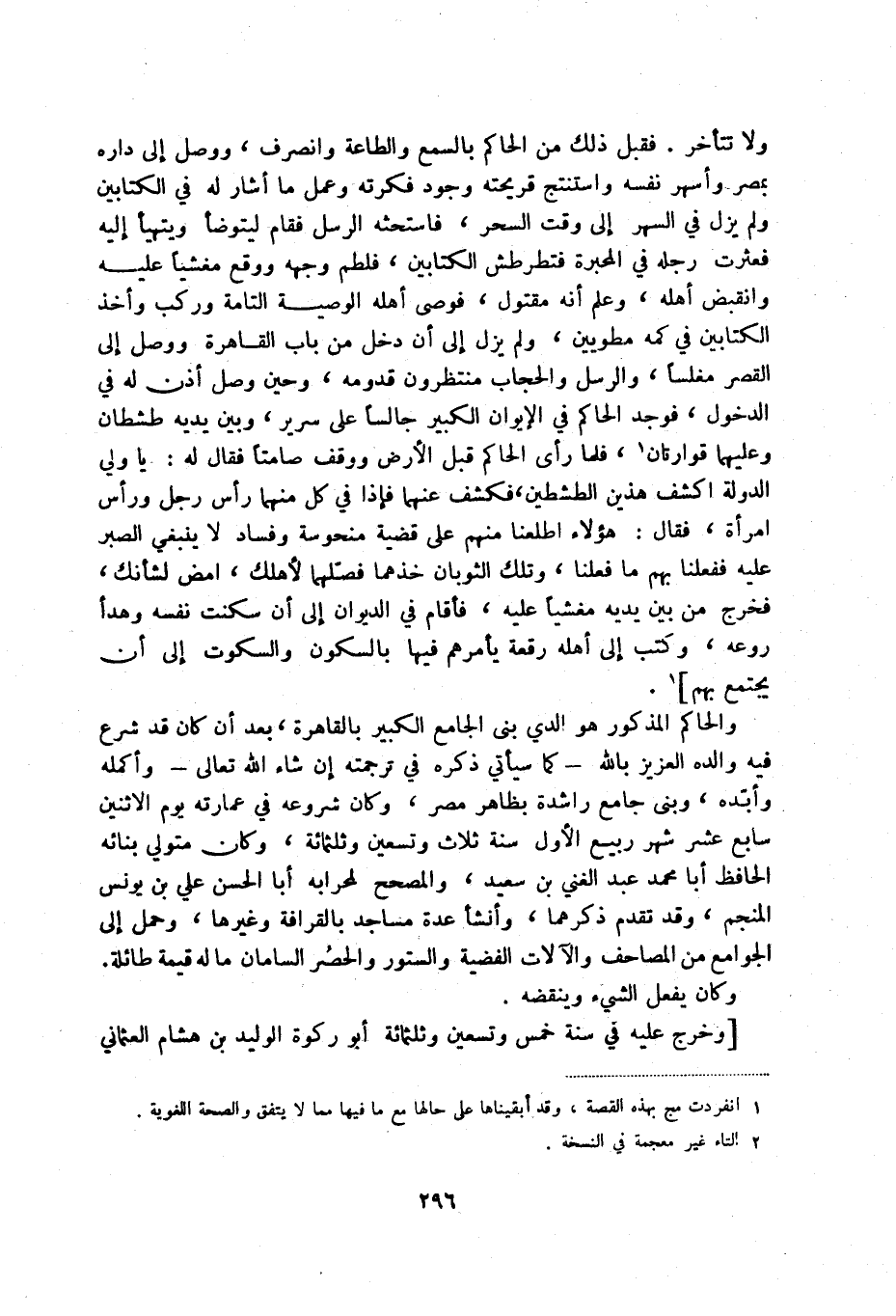 والحاكم المذكور هو الذي بنى الجامع الكبير بالقاهرة، بعد أن كان قد شرع فيه والده العزيز بالله كما سيأتي ذكره في ترجمته إن شاء الله تعالى وأكمله وأبده، وبنى جامع راشدة بظاهر مصر، وكان شروعه في عمارته يوم الاثنين سابع عشر شهر ربيع الأول سنة ثلاث وتسعين وثلثمائة، وكان متولي بنائه الحافظ أبا محمد عبد الغني بن سعيد، والمصحح لمحرابه أبا الحسن علي بن يونس المنجم، وقد تقدم ذكرهما، وأنشأ عدة مساجد بالقرافة وغيرها، وحمل إلى الجوامع من المصاحف والآلات الفضية والستور والحصر السامان ما له قيمة طائلة.