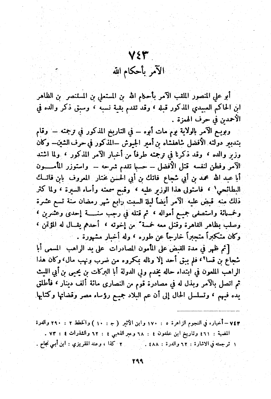 وبويع الآمر بالخلافة بالولاية يوم مات أبوه في التاريخح المذكور في ترجمته وقام بتدبير دولته الأفضل شاهنشاه بن أمير الجيوش المذكور في حرف الشين وكان وزير والده، وقد ذكرنا في ترجمته طرفاً من الآمر المذكور، ولما اشتد الآمر وفطن لنفسه قتل الأفضل حسبما تقدم شرحه، واستوزر المأمون أبت عبيد الله بن أبي شجاع فاتك بن أبي الحسن مختار المعروف بابن فاتك البطائحي (2) ، فاستولى هذا الوزير عليه، وقبح سمعته وأساء السيرة، ولما كثر ذلك منه قبض عليه الآمر أيضاً ليلة السبت رابع شهر رمضان سنة تسع عشرة وخمسمائة واستطفى جميع أمواله، ثم قتله في رجب سنة إحدى وعشرين، وصلب بظاهر القاهرة وقتل معه خمسةً من إخوته، أحدهم يقال له المؤتمن، وكان متكبراً متجبراً خارجاً عن طوره، وله أخبار مشهورة.
