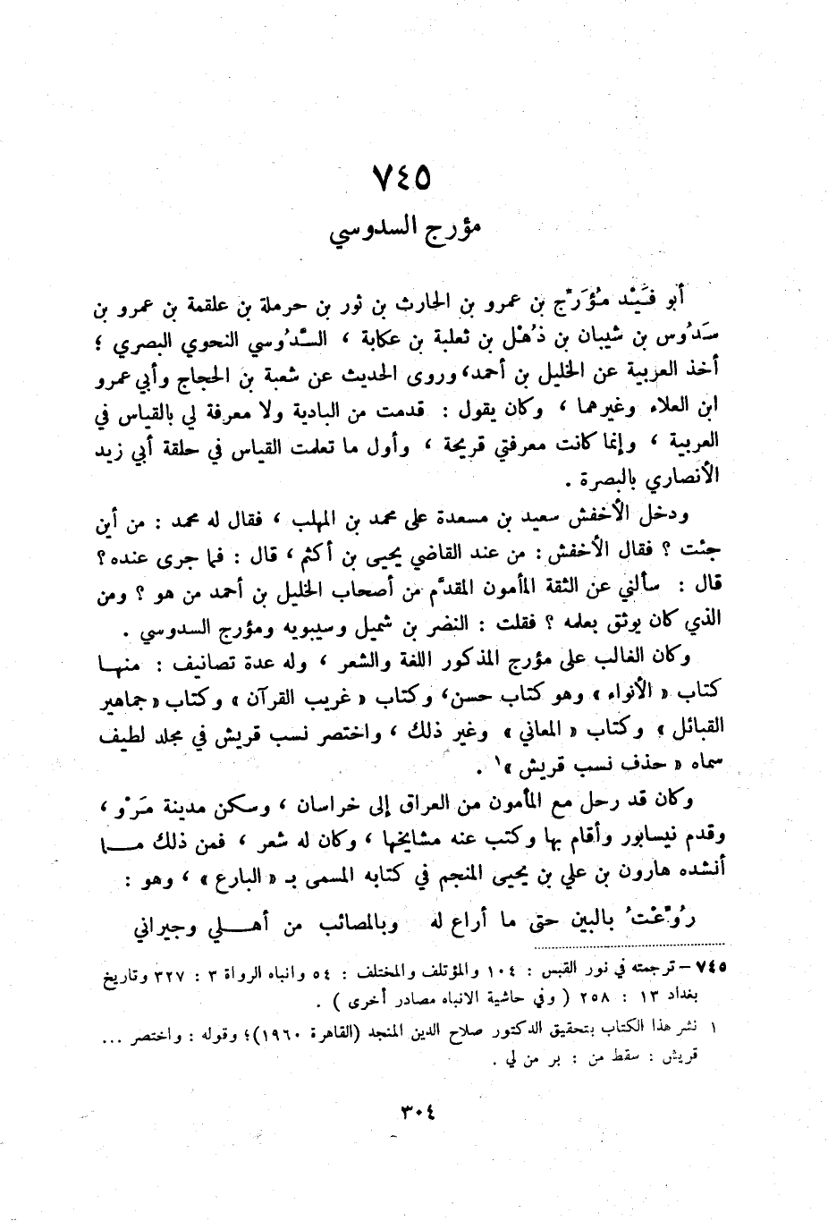 وكان الغالب على مؤرج المذكور اللغة والشعر، وله عدة تصانيف: منها كتاب الأنواء وهو كتاب حسن، وكتاب " غريب القرآن " وكتاب جماهير القبائل وكتاب المعاني وغير ذلك، واختصر نسب قريش في مجلد لطيف سماه " حذف نسب قريش (2) ".