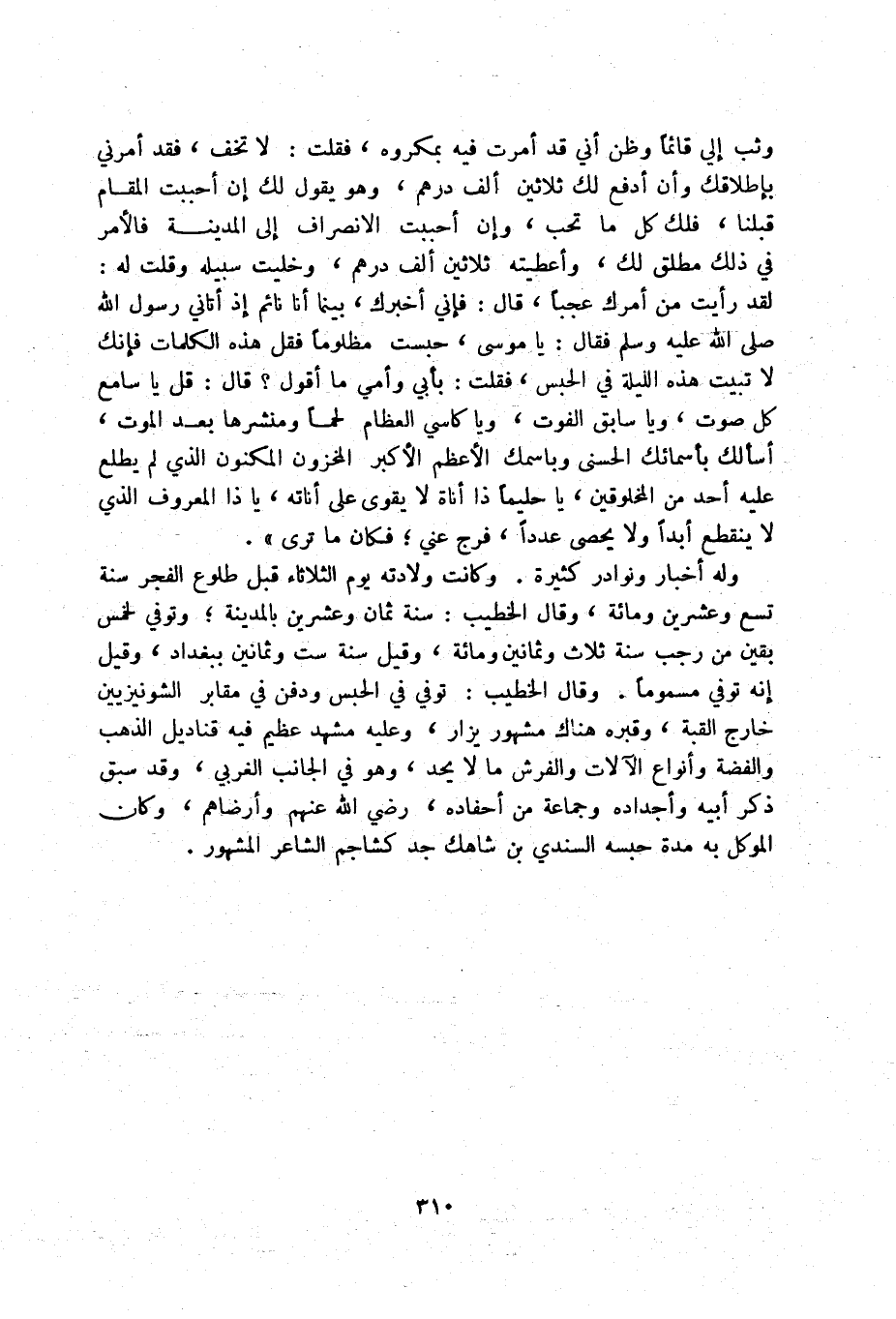 وثب إلي قائماً وظن أني قد أمرت فيه بمكروه، فقلت: لا تخف، فقد أمرني بإطلاقك وأن أدفع لك ثلاثين ألف درهم، وهو يقول لك إن أحببت المقام قبلنا، فلك كل ما تحب، وإن أحببت الانصراف إلى المدينة فالأمر في ذلك مطلق لك، وأعطيته ثلاثين ألف درهم، وخليت سبيله وقلت له: لقد رأيت من أمرك عجباً، قال: إني أخبرك، بينما أنا نائم إذ أتاني رسول الله صلى الله عليه وسلم فقال: يا موسى، حبست مظلوماً فقل هذه الكلمات فإنك لا تبيت هذه الليلة في الحبس، فقلت: بأبي وأمي ما أقول قال: قل يا سامع كل صوت، ويا سابق الفوت، ويا كاسي العظام لحماً ومنشرها بعد الموت، أسألك بأسمائك الحسنى وباسمك الأعظم الأكبر المخزون المكنون الذي لم يطلع عليه أحد من المخلوقين، يا حليماً ذا أناة لا يقوى على أناته، يا ذا المعروف الذي لا ينقطع أبداً ولا يحصى عدداً، فرج عني؛ فكان ما ترى ".