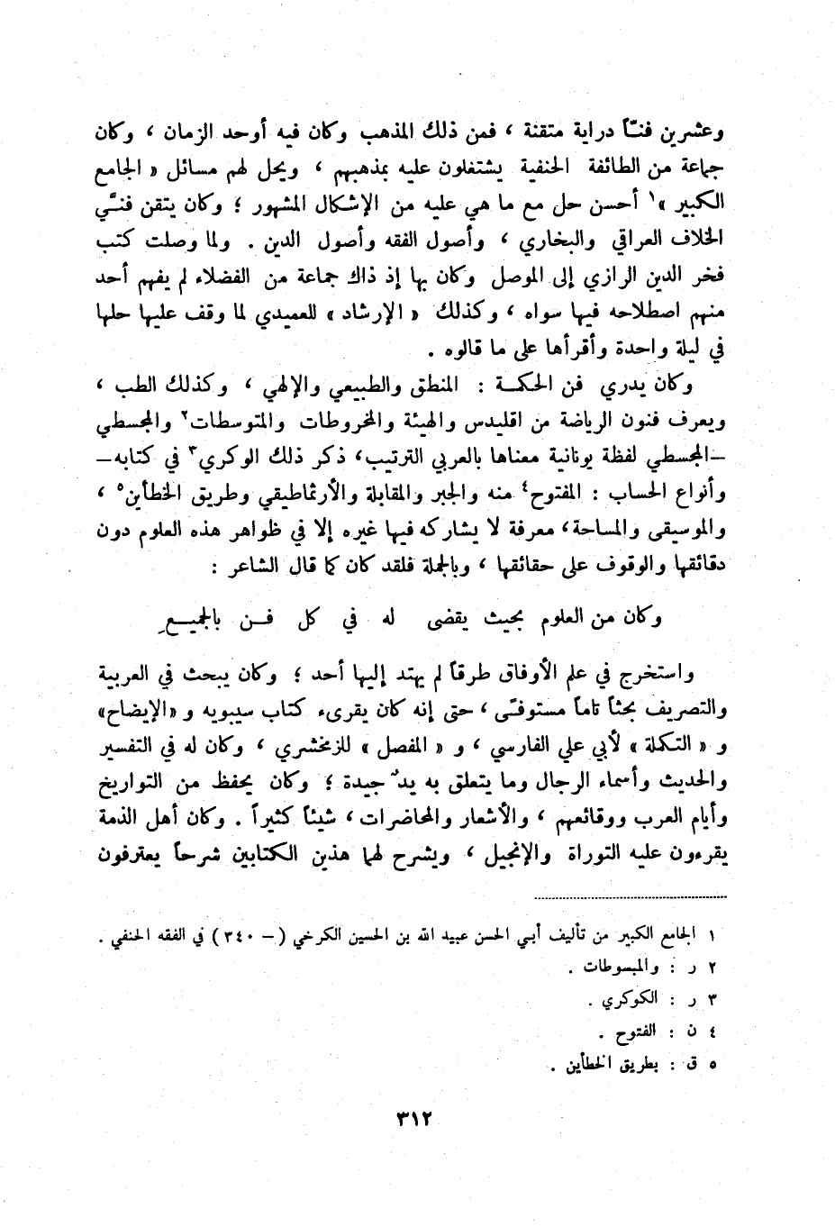 وكان يدري فن الحكمة: المنطق والطبيعي والإلهي، وكذلك الطب، ويعرف فنون الرياضة من اقليدس والهيئة والمخروطات والمتوسطات (2) والمجسطي المجسطي لفظة يونانية معناها بالعربي الترتيب، ذكر ذلك الوكري (3) في كتابه وأنواع الحساب: المفتوح (4) منه والجبر والمقابلة والأرثماطيقي وطريق الخطأين (5) ، والموسيقى والمساحة، معرفة لا يشاركه فيها غيره إلا في ظواهر هذه العلوم دون دقائقها والوقوف على حقائقها، وبالجملة فلقد كان كما قال الشاعر: