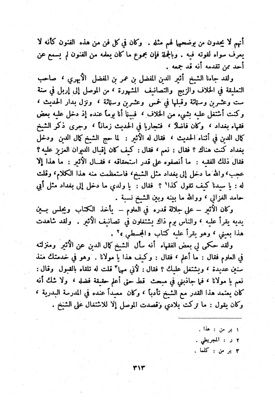 ولقد جاءنا الشيخ أثير الدين المفضل بن عمر بن المفضل الأبهري، صاحب التعليقة في الخلاف والزيج والتصانيف المشهورة، من الموصل إلى إربل في سنة ست وعشرين وستمائة وقبلها في خمس وعشرين وستمائة، ونزل بدار الحديث، وكنت أشتغل عليه بشيء من الخلاف، فبينما أنا يوماً عنده إذ دخل عليه بعض فقهاء بغداد، وكان فاضلاً، فتجارياً في الحديث زماناً، وجرى ذكر الشيخ كمال الدين في أثناء الحديث، فقال له الأثير: لما حج الشيخ كمال الدين ودخل بغداد كنت هناك فقال: نعم، فقال: كيف كان إقبال الديوان العزيز عليه فقال ذلك الفقيه: ما أنصفوه على قدر استحقاقه، فقال الأثير: ما هذا إلا عجب، والله ما دخل إلى بغداد مثل الشيخ، فاستعظمت منه هذا الكلام، وقلت له: يا سيدنا كيف تقول كذا (1) فقال: يا ولدي ما دخل إلى بغداد مثل أبي حامد الغزالي، ووالله ما بينه وبين الشيخ نسبة.