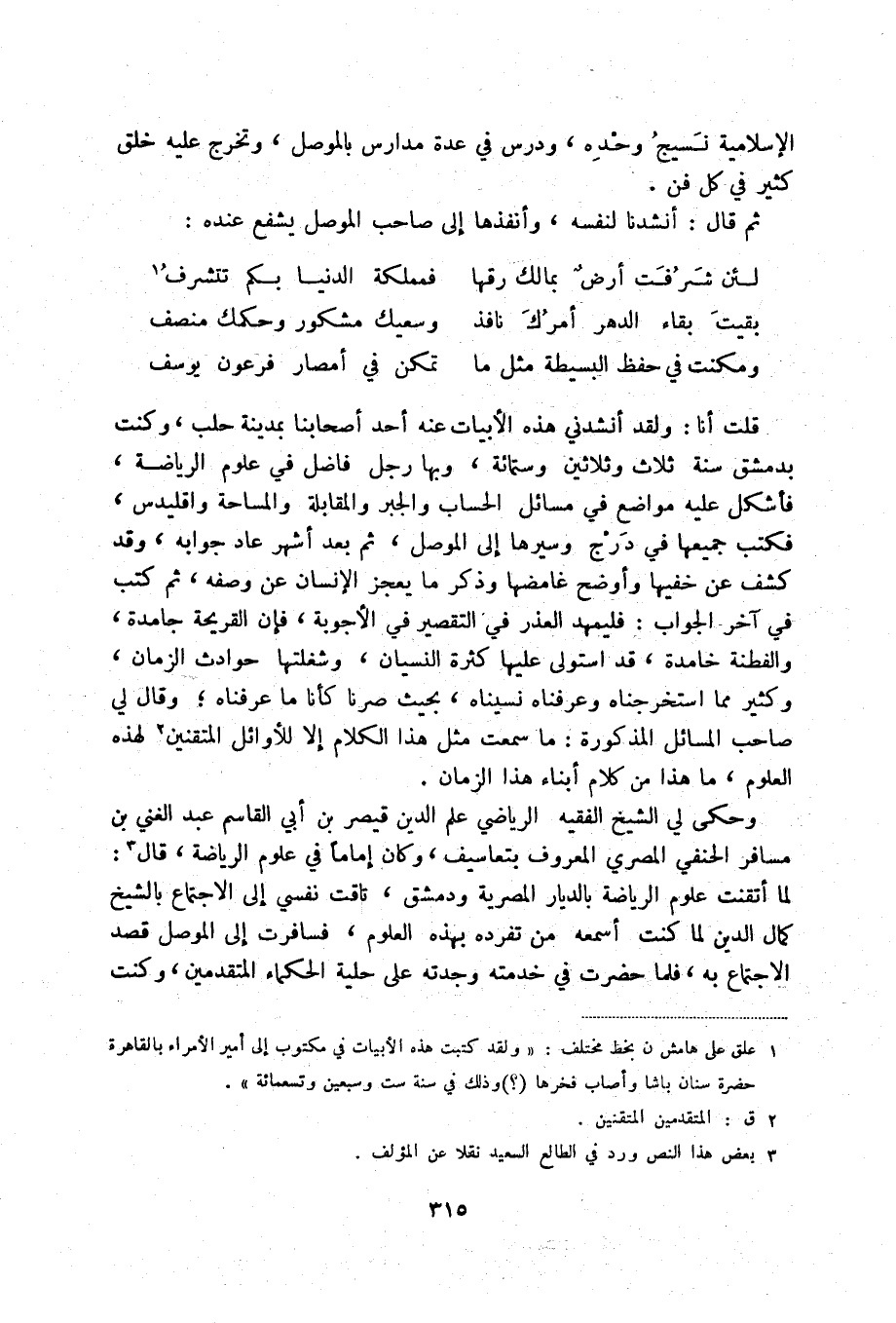 ومكنت في حفظ البسيطة مثل ما ... تمكن في أمصار فرعون يوسف قلت أنا: ولقد أنشدني هذه الأبيات عنه أحد أصحابنا بمدينة حلب، وكنت بدمشق سنة ثلاث وثلاثين وستمائة، وبها رجل فاضل في علوم الرياضة، فأشكل عليه مواضع في مسائل الحساب والجبر والمقابلة والمساحة واقليدس، فكتب جميعها في درج وسيرها إلى الموصل، ثم بعد أشهر عاد جوابه، وقد كشف عن خفيها وأوضح غامضها وذكر ما يعجز الإنسان عن وصفه، ثم كتب في آخر الجواب: فليمهد العذر في التقصير في الأجوبة، فإن القريحة جامدة، والفطنة خامدة، قد استولى عليها كثرة النسيان، وشغلتها حوادث الزمان، وكثير مما استخرجناه وعرفناه نسيناه، بحيث صرنا كأنا ما عرفناه؛ وقال لي صاحب المسائل المذكورة: ما سمعت مثل هذا الكلام إلا للأوائل المتقنين (2) لهذه العلوم، ما هذا من كلام أبناء هذا الزمان.