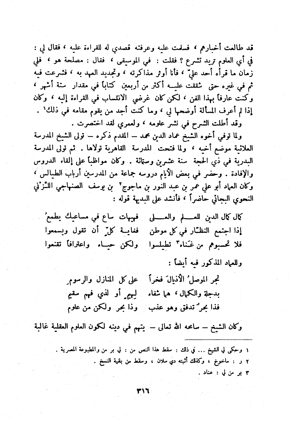 قد طالعت أخبارهم، فسلمت عليه وعرفته قصدي له للقراءة عليه، فقال لي: في أي العلوم تريد تشرع فقلت: في الموسيقى، فقال: مصلحة هو، فلي زمان ما قرأه أحد عليّ، فأنا أوثر مذاكرته، وتجديد العهد به، فشرعت فيه ثم في غيره حتى شققت عليه أكثر من أربعين كتاباً في مقدار ستة أشهر، وكنت عارفاً بهذا الفن، لكن كان غرضي الانتساب في القراءة إليه، وكان إذا لم أعرف المسألة أوضحها لي، وما كنت أجد من يقوم مقامه في ذلك (1) .