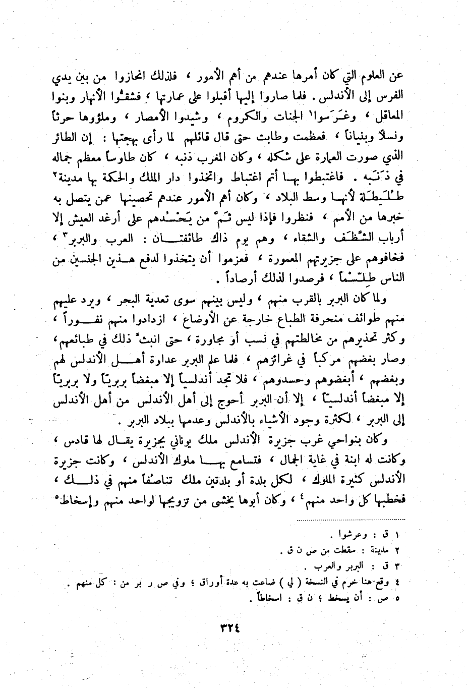 ولما كان البربر بالقرب منهم، وليس بينهم سوى تعدية البحر، ويرد عليهم منهم طوائف منحرفة الطباع خارجة عن الأوضاع، وازدادوا منهم نفراً، وكثر تحذيرهم من مخالطتهم في نسب أو مجاورة، حتى انبث ذلك في طبائعهم، وصار بغضهم مركباً في غرائزهم، فلما علم البربر عداوة أهل الأندلس لهم وبغضهم، أبغضوهم وجسدوهم، فلا تجد أندلسياً إلا مبغضاً بربرياً ولا بربرياً إلا مبغضاً أندلسياً، إلا أن البربر أحوج إلى أهل الأندلس من أهل الأندلس إلى البربر، لكثرة وجود الأشياء بالأندلس وعدمها ببلاد البربر.