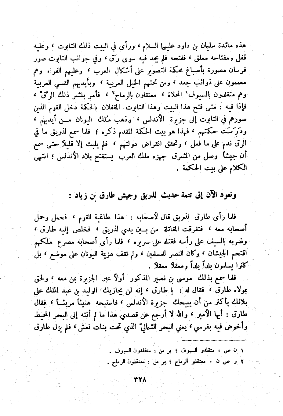 هذه مائدة سليمان بن داودعليهما السلام، ورأى في البيت ذلك التابوت، وعليه قفل ومفتاحه معلق، ففتحه فلم يجد فيه سوى رق، وفي جوانب التابوت صور فرسان مصورة بأصباغ محكمة التصوير على أشكال العرب، وعليهم الفراء وهم معممون على ذوائب جعد، ومن تحتهم الخيل العربية، وبأيديهم القسي العربية وهم متقلدون بالسيوف (1) المحلاة، معتقلون بالرماح (2) ، فأمر بنشر ذلك الرق، فإذا فيه: متى فتح هذا الباب وهذا التابوت المقفلان بالحكمة دخل القوم الذين صورهم في التابوت إلى جزيرة الأندلس، وذهب ملك اليونان من أيديهم، ودرست حكمتهم، فهذا هو بيت الحكمة المقدم ذكره؛ فلما سمع لذريق ما في الرق ندم على ما فعل، وتحقق انقراض دولتهم، فلم يلبث إلا قليلاً حتى سمع أن جيشاً وصل من المشرق جهزه ملك العرب يستفتح بلاد الأندلس؛ انتهى الكلام على بيت الحكمة.