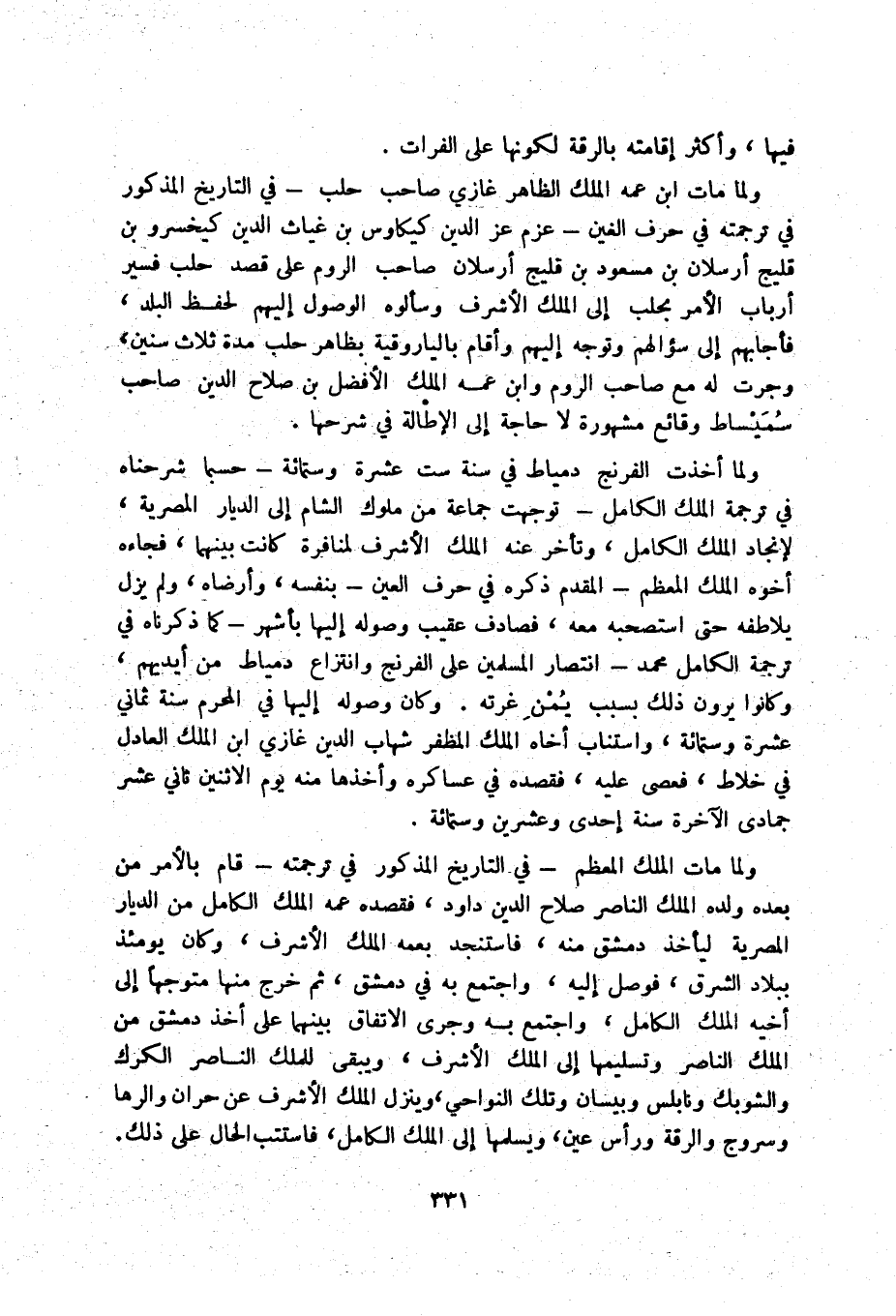 ولما أخذت الفرنج دمياط في سنة ست عشرة وستمائة - حسبما شرحناه في ترجمة الملك الكامل - توجهت جماعة من ملوك الشام إلى الديار المصرية، لإنجاد الملك الكامل، وتأخر عنه الملك الأشرف لمنافرة كانت بينهما، فجاءه أخوه الملك العظيم - المقدم ذكره في حرف العين - بنفسه، وأرضاه، ولم يزل بلاطفه حتى استصبحه معه، فصادف عقيب وصوله إليها بأشهر - كما ذكرناه في ترجمة الكامل محمد - انتصار المسلمين على الفرنج وانتزاع دمياط من أيديهم، وكانوا يرون ذلك بسب يمن غرته. وكان وصوله إليها في المحرم سنة ثماني عشرة وستمائة، واستناب أخاه الملك المظفر شهاب الدبن غازي ابن الملك العادل في خلاط، فعصى عليه، فقصده في عساكره وأخذها منه يوم الاثنين ثاني عشر جمادى الآخرة سنة إحدى وعشرين وستمائة.
