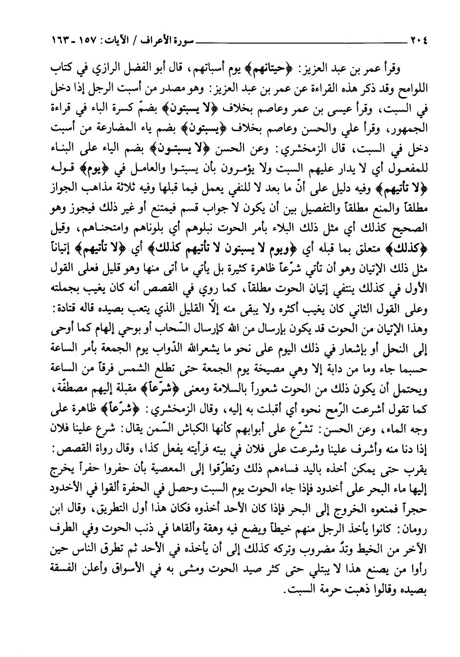 وَقَرَأَ عُمَرُ بْنُ عَبْدِ الْعَزِيزِ: حِيتانُهُمْ يَوْمَ أَسْبَاتِهِمْ، قَالَ أَبُو الْفَضْلِ الرَّازِيُّ فِي كِتَابِ اللَّوَامِحِ وَقَدْ ذَكَرَ هَذِهِ الْقِرَاءَةَ عَنْ عُمَرَ بْنِ عَبْدِ العزيز: وَهُوَ مَصْدَرٌ مِنْ أَسْبَتَ الرَّجُلُ إِذَا دَخَلَ فِي السَّبْتِ، وَقَرَأَ عِيسَى بْنُ عُمَرَ وَعَاصِمٌ بِخِلَافٍ لَا يَسْبِتُونَ بِضَمِّ كَسْرَةِ الْبَاءِ فِي قِرَاءَةِ الْجُمْهُورِ،