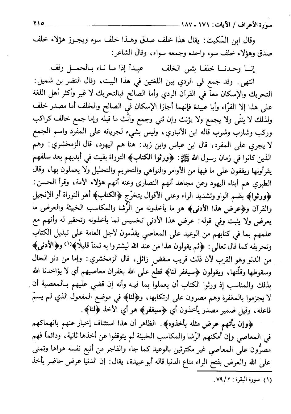 التَّحْرِيكُ وَالْإِسْكَانُ مَعًا فِي الْقُرْآنِ الرَّدَى وَأَمَّا الصَّالِحُ فَبِالتَّحْرِيكِ لَا غَيْرُ وَأَكْثَرُ أَهْلِ اللُّغَةِ عَلَى هَذَا إِلَّا الْفَرَّاءَ وَأَبَا عُبَيْدَةَ فَإِنَّهُمَا أَجَازَا الْإِسْكَانَ فِي الصَّالِحِ وَالْخَلَفُ إِمَّا مَصْدَرُ خَلَفَ وَلِذَلِكَ لَا يُثَنَّى وَلَا يُجْمَعُ وَلَا يُؤَنَّثُ وَإِنْ ثُنِّيَ وَجُمِعَ وَأُنِّثَ مَا قَبْلَهُ وَأَمَّا جَمْعُ خَالِفٍ كَرَاكِبٍ وَرَكْبٍ وَشَارِبٍ وَشَرْبٍ قَالَهُ ابْنُ الْأَنْبَارِيِّ، وَلَيْسَ بِشَيْءٍ لِجَرَيَانِهِ عَلَى الْمُفْرَدِ وَاسْمِ الْجَمْعِ لَا يَجْرِي عَلَى الْمُفْرَدِ، قَالَ ابْنُ عَبَّاسٍ وَابْنُ زَيْدٍ: هُنَا هُمُ الْيَهُودُ، قَالَ الزَّمَخْشَرِيُّ: وَهُمُ الَّذِينَ كَانُوا فِي زَمَانِ رسول الله صلى اللَّهُ عَلَيْهِ وَسَلَّمَ: وَرِثُوا الْكِتابَ التَّوْرَاةَ بَقِيَتْ فِي أَيْدِيهِمْ بَعْدَ سَلَفِهِمْ يَقْرَأُونَهَا وَيَقِفُونَ عَلَى مَا فِيهَا مِنْ الْأَوَامِرِ وَالنَّوَاهِي وَالتَّحْرِيمِ وَالتَّحْلِيلِ وَلَا يَعْمَلُونَ بِهَا، وَقَالَ الطَّبَرِيُّ هُمْ أَبْنَاءُ الْيَهُودِ وَعَنْ مُجَاهِدٍ أَنَّهُمُ النَّصَارَى وَعَنْهُ أَنَّهُمْ هَؤُلَاءِ الْأُمَّةُ، وَقَرَأَ الْحَسَنُ: