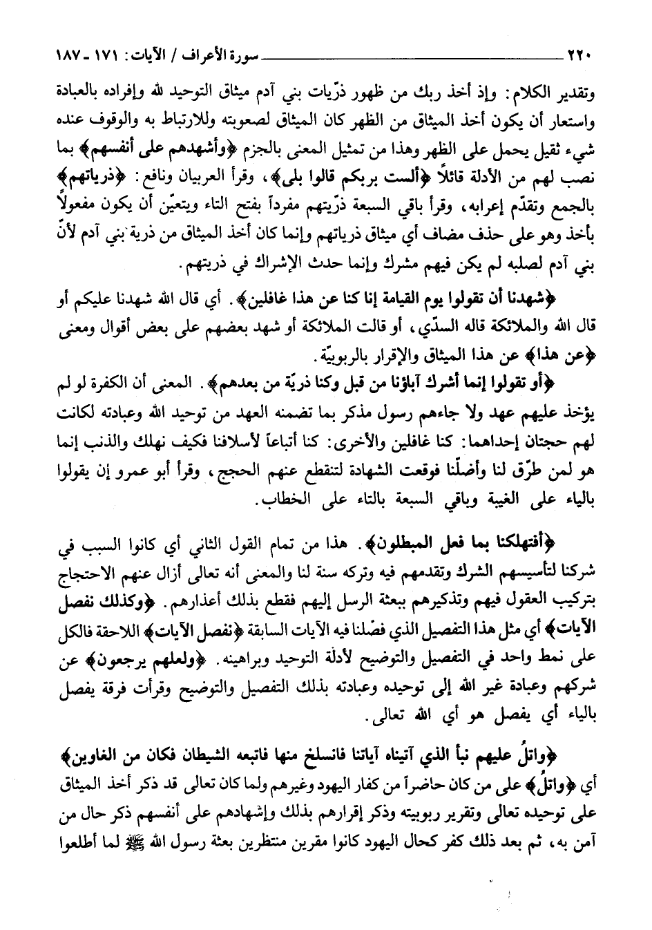 وَتَقْدِيرُ الْكَلَامِ: وَإِذْ أَخَذَ رَبُّكَ مِنْ ظُهُورِ ذُرِّيَّاتِ بَنِي آدَمَ مِيثَاقَ التَّوْحِيدِ لِلَّهِ وَإِفْرَادِهِ بِالْعِبَادَةِ وَاسْتَعَارَ أَنْ يَكُونَ أُخِذَ الْمِيثَاقُ مِنَ الظَّهْرِ كَأَنَّ الْمِيثَاقَ لِصُعُوبَتِهِ وَلِلِارْتِبَاطِ بِهِ وَالْوُقُوفِ عِنْدَهُ شَيْءٌ ثَقِيلٌ يُحْمَلُ عَلَى الظَّهْرِ وَهَذَا مِنْ تَمْثِيلِ الْمَعْنَى بِالْجَزْمِ وَأَشْهَدَهُمْ عَلى أَنْفُسِهِمْ بِمَا نَصَبَ لَهُمْ مِنَ الْأَدِلَّةِ قَائِلًا أَلَسْتُ بِرَبِّكُمْ قالُوا بَلى، وَقَرَأَ الْعَرَبِيَّانِ وَنَافِعٌ: ذُرِّيَّاتِهِمْ بِالْجَمْعِ وَتَقَدَّمَ إِعْرَابُهُ، وَقَرَأَ بَاقِي السَّبْعَةِ ذَرِّيَّتَهُمْ مُفْرَدًا بِفَتْحِ التَّاءِ وَيَتَعَيَّنُ أَنْ يَكُونَ مَفْعُولًا بِأَخَذَ وَهُوَ عَلَى حَذْفِ مُضَافٍ أَيْ مِيثَاقَ ذُرِّيَّاتِهِمْ وَإِنَّمَا كَانَ أَخَذَ الْمِيثَاقَ مِنْ ذُرِّيَّةِ بَنِي آدَمَ لِأَنَّ بَنِي آدَمَ لِصُلْبِهِ لَمْ يَكُنْ فِيهِمْ مُشْرِكٌ وَإِنَّمَا حَدَثَ الْإِشْرَاكُ فِي ذُرِّيَّتِهِمْ.