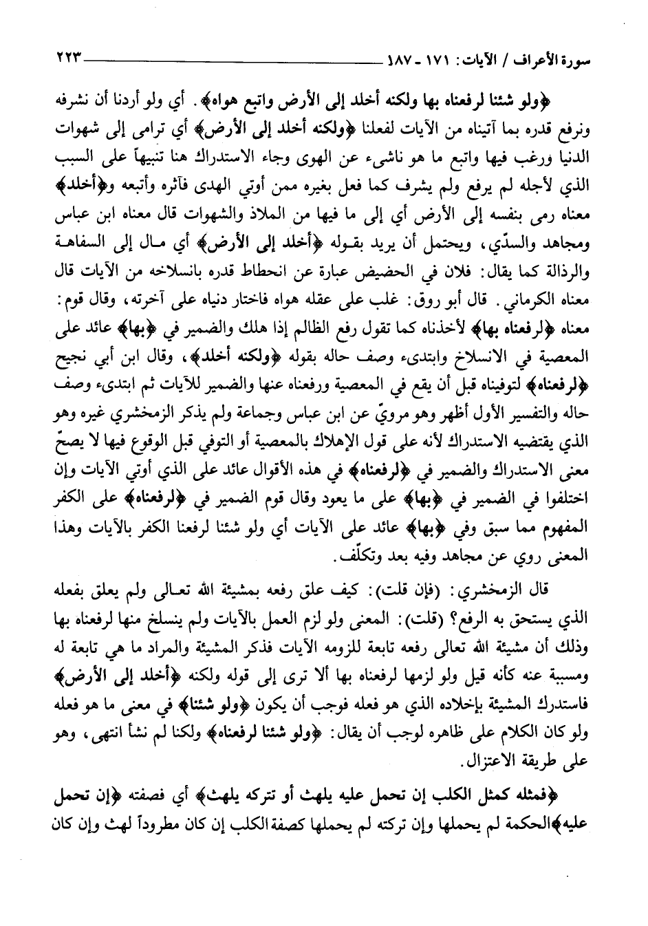 قَالَ الزَّمَخْشَرِيُّ: (فَإِنْ قُلْتَ) : كَيْفَ عُلِّقَ رَفْعُهُ بِمَشِيئَةِ اللَّهِ تَعَالَى وَلَمْ يُعَلَّقْ بِفِعْلِهِ الَّذِي يَسْتَحِقُّ بِهِ الرَّفْعَ؟ (قُلْتُ) : الْمَعْنَى وَلَوْ لَزِمَ الْعَمَلَ بِالْآيَاتِ وَلَمْ يَنْسَلِخْ مِنْهَا لَرَفَعْنَاهُ بِهَا وَذَلِكَ أَنَّ مَشِيئَةَ اللَّهِ تَعَالَى رَفْعَهُ تَابِعَةٌ لِلُزُومِهِ الْآيَاتِ فَذَكَرَ الْمَشِيئَةَ وَالْمُرَادُ مَا هِيَ تَابِعَةٌ لَهُ وَمُسَبَّبَةٌ عَنْهُ كَأَنَّهُ قِيلَ وَلَوْ لَزِمَهَا لَرَفَعْنَاهُ بِهَا أَلَا تَرَى إِلَى قَوْلِهِ وَلَكِنَّهُ أَخْلَدَ إِلَى الْأَرْضِ فَاسْتَدْرَكَ الْمَشِيئَةَ بِإِخْلَادِهِ الَّذِي هُوَ فَعَلَهُ فَوَجَبَ أَنْ يَكُونَ وَلَوْ شِئْنا فِي مَعْنَى مَا هُوَ فَعَلَهُ وَلَوْ كَانَ الْكَلَامُ عَلَى ظَاهِرِهِ لَوَجَبَ أَنْ يُقَالَ: وَلَوْ شِئْنا لَرَفَعْناهُ وَلَكِنَّا لَمْ نَشَأِ انْتَهَى، وَهُوَ عَلَى طَرِيقَةِ الِاعْتِزَالِ.