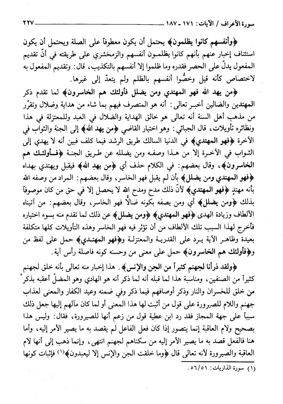 مَنْ يَهْدِ اللَّهُ فَهُوَ الْمُهْتَدِي وَمَنْ يُضْلِلْ فَأُولئِكَ هُمُ الْخاسِرُونَ لَمَّا تَقَدَّمَ ذِكْرُ الْمُهْتَدِينَ وَالضَّالِّينَ أَخْبَرَ تَعَالَى: أَنَّهُ هُوَ الْمُتَصَرِّفُ فِيهِمْ بِمَا شَاءَ مِنْ هِدَايَةٍ وَضَلَالٍ وَتَقَرَّرَ مِنْ مَذْهَبِ أَهْلِ السُّنَّةِ أَنَّهُ تَعَالَى هُوَ خَالِقُ الْهِدَايَةِ وَالضَّلَالِ فِي الْعَبْدِ وَلِلْمُعْتَزِلَةِ فِي هَذَا وَنَظَائِرِهِ تَأْوِيلَاتٌ، قَالَ الْجُبَّائِيُّ: وَهُوَ اخْتِيَارُ الْقَاضِي مَنْ يَهْدِ اللَّهُ إِلَى الْجَنَّةِ وَالثَّوَابِ فِي الْآخِرَةِ فَهُوَ الْمُهْتَدِي فِي الدُّنْيَا السَّالِكُ طَرِيقَ الرُّشْدِ فِيمَا كُلِّفَ فَبَيَّنَ أَنَّهُ لَا يَهْدِي إِلَى الثَّوَابِ فِي الْآخِرَةِ إِلَّا مَنْ هَذَا وَصْفُهُ وَمَنْ يُضْلِلْهُ عَنْ طَرِيقِ الْجَنَّةِ فَأُولئِكَ هُمُ الْخاسِرُونَ، وَقَالَ بَعْضُهُمْ: فِي الْكَلَامِ حَذْفٌ أَيْ مَنْ يَهْدِ اللَّهُ فَيَقْبَلُ وَيَهْتَدِي بِهُدَاهُ فَهُوَ الْمُهْتَدِي وَمَنْ يُضْلِلْ بِأَنْ لَمْ يَقْبَلْ فَهُوَ الْخَاسِرُ، وَقَالَ بَعْضُهُمُ: الْمُرَادُ مَنْ وَصَفَهُ اللَّهُ بِأَنَّهُ مُهْتَدٍ فَهُوَ الْمُهْتَدِي لِأَنَّ ذَلِكَ مَدْحٌ وَمَدْحُ اللَّهِ لَا يَحْصُلُ إِلَّا فِي حَقِّ مَنْ كَانَ مَوْصُوفًا بِذَلِكَ وَمَنْ يُضْلِلْ أَيْ وَمَنْ يَصِفُهُ بِكَوْنِهِ ضَالًّا فَهُوَ الْخَاسِرُ، وَقَالَ بَعْضُهُمْ: مَنْ آتَيْنَاهُ الْأَلْطَافَ وَزِيَادَةَ الْهُدَى فَهُوَ الْمُهْتَدِي وَمَنْ يُضْلِلْ عَنْ ذَلِكَ لِمَا تَقَدَّمَ مِنْهُ بِسُوءِ اخْتِيَارِهِ فَأَخْرَجَ لِهَذَا السَّبَبِ تِلْكَ الْأَلْطَافَ مِنْ أَنْ تُؤَثِّرَ فِيهِ فَهُوَ الْخَاسِرُ وَهَذِهِ التَّأْوِيلَاتُ كُلُّهَا مُتَكَلَّفَةٌ بَعِيدَةٌ وَظَاهِرُ الْآيَةِ يَرُدُّ عَلَى الْقَدَرِيَّةِ والمعتزلة وفَهُوَ الْمُهْتَدِي حُمِلَ عَلَى لَفْظِ من وفَأُولئِكَ هُمُ الْخاسِرُونَ حُمِلَ عَلَى مَعْنَى مِنْ وَحَسَّنَهُ كَوْنُهُ فَاصِلَةَ رَأْسِ آيَةٍ.