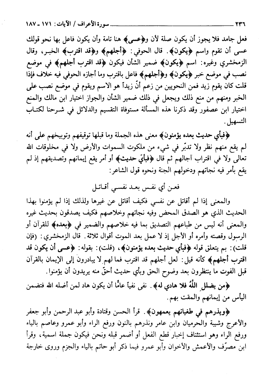 فَعَنْ أَيِّ نَفْسٍ بَعْدَ نَفْسِي أُقَاتِلُ وَالْمَعْنَى إِذَا لَمْ أُقَاتِلْ عَنْ نَفْسِي فَكَيْفَ أُقَاتِلُ عَنْ غَيْرِهَا وَلِذَلِكَ إِذَا لَمْ يُؤْمِنُوا بِهَذَا الْحَدِيثِ الَّذِي هُوَ الصِّدْقُ الْمَحْضُ وَفِيهِ نَجَاتُهُمْ وَخَلَاصُهُمْ فَكَيْفَ يُصَدِّقُونَ بِحَدِيثٍ غَيْرِهِ وَالْمَعْنَى أَنَّهُ لَيْسَ مِنْ طِبَاعِهِمُ التَّصْدِيقُ بِمَا فِيهِ خَلَاصُهُمْ وَالضَّمِيرُ فِي بَعْدَهُ لِلْقُرْآنِ أَوِ الرَّسُولِ وَقِصَّتِهِ وَأَمْرِهِ أَوِ الْأَجَلِ إِذْ لَا عَمَلَ بَعْدَ الْمَوْتِ أَقْوَالٌ ثَلَاثَةٌ. قَالَ الزَّمَخْشَرِيُّ: (فَإِنْ قُلْتَ) : بِمَ يَتَعَلَّقُ قَوْلُهُ فَبِأَيِّ حَدِيثٍ بَعْدَهُ يُؤْمِنُونَ، (قُلْتُ) : بِقَوْلِهِ: عَسى أَنْ يَكُونَ قَدِ اقْتَرَبَ أَجَلُهُمْ كَأَنَّهُ قِيلَ: لَعَلَّ أَجْلَهُمْ قَدِ اقْتَرَبَ فَمَا لَهُمْ لَا يُبَادِرُونَ إِلَى الْإِيمَانِ بِالْقُرْآنِ قَبْلَ الْفَوْتِ مَا يَنْتَظِرُونَ بَعْدَ وُضُوحِ الْحَقِّ وَبِأَيِّ حَدِيثٍ أَحَقَّ مِنْهُ يُرِيدُونَ أَنْ يُؤْمِنُوا.