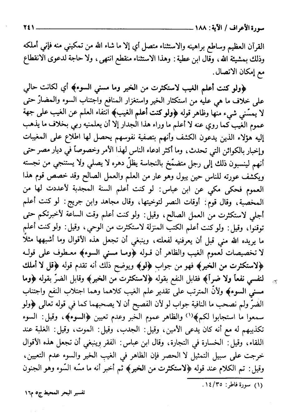 وَلَوْ كُنْتُ أَعْلَمُ الْغَيْبَ لَاسْتَكْثَرْتُ مِنَ الْخَيْرِ وَما مَسَّنِيَ السُّوءُ أَيْ لَكَانَتْ حَالِي عَلَى خِلَافُ مَا هِيَ عَلَيْهِ مِنِ اسْتِكْثَارِ الْخَيْرِ وَاسْتِغْزَارِ الْمَنَافِعِ وَاجْتِنَابِ السُّوءِ وَالْمَضَارِّ حَتَّى لَا يَمَسَّنِي شَيْءٌ مِنْهَا وَظَاهِرُ قَوْلِهِ وَلَوْ كُنْتُ أَعْلَمُ الْغَيْبَ انْتِفَاءُ الْعِلْمِ عَنِ الْغَيْبِ عَلَى جِهَةِ عُمُومِ الْغَيْبِ كَمَا