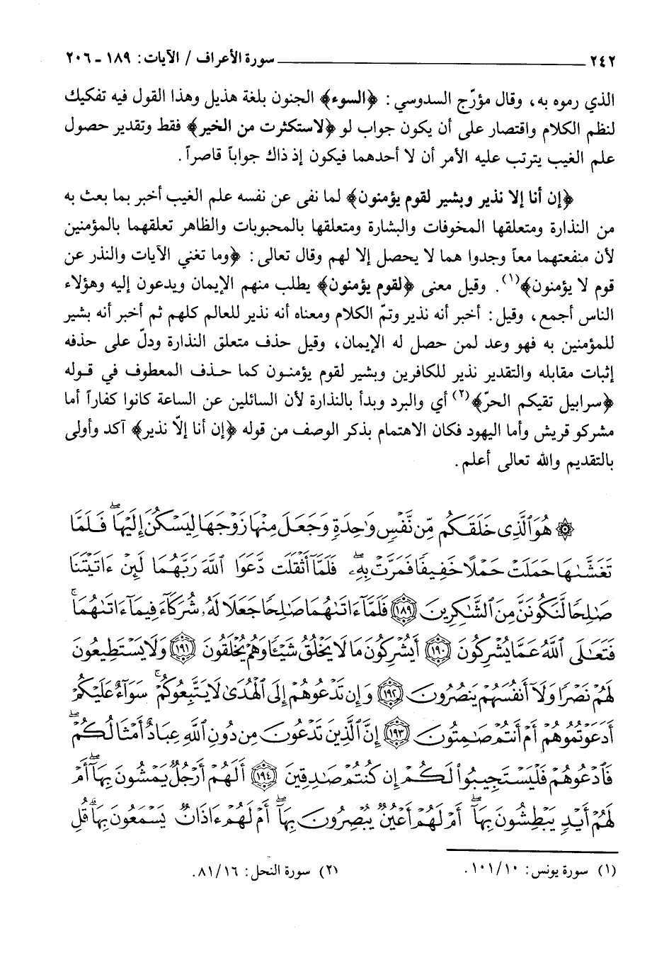 هُوَ الَّذِي خَلَقَكُمْ مِنْ نَفْسٍ واحِدَةٍ وَجَعَلَ مِنْها زَوْجَها لِيَسْكُنَ إِلَيْها فَلَمَّا تَغَشَّاها حَمَلَتْ حَمْلاً خَفِيفاً فَمَرَّتْ بِهِ فَلَمَّا أَثْقَلَتْ دَعَوَا اللَّهَ رَبَّهُما لَئِنْ آتَيْتَنا صالِحاً لَنَكُونَنَّ مِنَ الشَّاكِرِينَ (189) فَلَمَّا آتاهُما صالِحاً جَعَلا لَهُ شُرَكاءَ فِيما آتاهُما فَتَعالَى اللَّهُ عَمَّا يُشْرِكُونَ (190) أَيُشْرِكُونَ مَا لَا يَخْلُقُ شَيْئاً وَهُمْ يُخْلَقُونَ (191) وَلا يَسْتَطِيعُونَ لَهُمْ نَصْراً وَلا أَنْفُسَهُمْ يَنْصُرُونَ (192) وَإِنْ تَدْعُوهُمْ إِلَى الْهُدى لَا يَتَّبِعُوكُمْ سَواءٌ عَلَيْكُمْ أَدَعَوْتُمُوهُمْ أَمْ أَنْتُمْ صامِتُونَ (193)