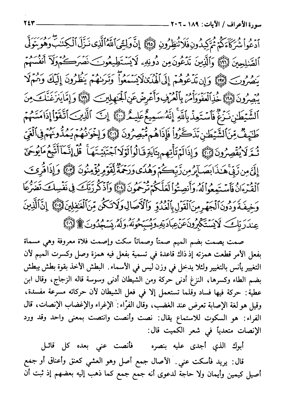 صَمَتَ يَصْمُتُ بِضَمِّ الْمِيمِ صَمْتًا وَصُمَاتًا سَكَتَ وَإِصْمِتْ فَلَاةَ مَعْرُوفَةٌ وَهِيَ مُسَمَّاةٌ بِفِعْلِ الْأَمْرِ قُطِعَتْ هَمْزَتُهُ إِذْ ذَاكَ قَاعِدَةٌ فِي تسمية بِفِعْلٍ فِيهِ هَمْزَةُ وَصْلٍ وَكُسِرَتِ الْمِيمُ لِأَنَّ التَّغْيِيرَ يَأْنَسُ بِالتَّغْيِيرِ وَلِئَلَّا يَدْخُلَ فِي وَزْنٍ لَيْسَ فِي الْأَسْمَاءِ. الْبَطْشُ الْأَخْذُ بِقُوَّةٍ بَطَشَ يَبْطِشُ بِضَمِّ الطَّاءِ وكسرها، النزغ أَدْنَى حَرَكَةٍ وَمِنَ الشَّيْطَانِ أَدْنَى وَسْوَسَةٍ قَالَهُ الزَّجَّاجُ، وَقَالَ ابْنُ عَطِيَّةَ: حَرَكَةٌ فِيهَا فَسَادٌ وَقَلَّمَا تُسْتَعْمَلُ إِلَّا فِي فِعْلِ الشَّيْطَانِ لِأَنَّ حَرَكَاتِهِ مُسْرِعَةٌ مُفْسِدَةٌ، وَقِيلَ هُوَ لُغَةُ الْإِصَابَةِ تَعْرِضُ عِنْدَ الْغَضَبِ، وَقَالَ الْفَرَّاءُ: الْإِغْرَاءُ وَالْإِغْضَابُ الْإِنْصَاتُ، قَالَ الْفَرَّاءُ: هُوَ السُّكُوتُ لِلِاسْتِمَاعِ يُقَالُ: نَصَتَ وَأَنْصَتَ وَانْتَصَتَ بِمَعْنًى وَاحِدٍ وَقَدْ وَرَدَ الْإِنْصَاتُ مُتَعَدِّيًا فِي شِعْرِ الْكُمَيْتِ قَالَ:
