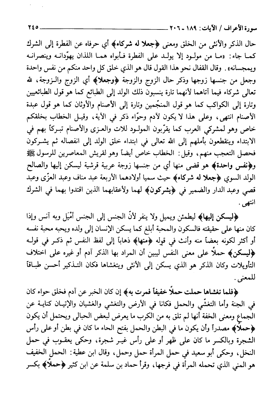 وَقَالَ الْقَفَّالُ نَحْوَ هَذَا الْقَوْلِ قَالَ هُوَ الَّذِي خَلَقَ كُلَّ وَاحِدٍ مِنْكُمْ مِنْ نَفْسٍ وَاحِدَةٍ وَجَعَلَ مِنْ جِنْسِهَا زَوْجَهَا وَذَكَرَ حَالَ الزَّوْجِ وَالزَّوْجَةِ وجَعَلا أَيِ الزَّوْجُ وَالزَّوْجَةُ، لِلَّهِ تَعَالَى شُرَكَاءَ فِيمَا آتَاهُمَا لِأَنَّهُمَا تَارَةً يَنْسُبُونَ ذَلِكَ الْوَلَدَ إِلَى الطَّبَائِعِ كَمَا هُوَ قَوْلُ الطَّبَائِعِيِّينَ وَتَارَةً إِلَى الْكَوَاكِبِ كَمَا هُوَ قَوْلُ الْمُنَجِّمِينَ وَتَارَةً إِلَى الْأَصْنَامِ وَالْأَوْثَانِ كَمَا هُوَ قَوْلُ عَبَدَةِ الْأَصْنَامِ انْتَهَى، وَعَلَى هَذَا لَا يَكُونُ لِآدَمَ وَحَوَّاءَ ذِكْرٌ فِي الْآيَةِ، وَقِيلَ الْخِطَابُ بِخَلَقَكُمْ خَاصٌّ وَهُوَ لِمُشْرِكِي الْعَرَبِ كَمَا يُقَرِّبُونَ الْمَوْلُودَ لِلَّاتَ وَالْعُزَّى وَالْأَصْنَامِ تَبَرُّكًا بِهِمْ فِي الِابْتِدَاءِ وَيَنْقَطِعُونَ بِأَمَلِهِمْ إِلَى اللَّهِ تَعَالَى فِي ابْتِدَاءِ خَلْقِ الْوَلَدِ إِلَى انْفِصَالِهِ ثُمَّ يُشْرِكُونَ فَحَصَلَ التَّعَجُّبُ مِنْهُمْ، وَقِيلَ: الْخِطَابُ خَاصٌّ أَيْضًا وَهُوَ لِقُرَيْشٍ الْمُعَاصِرِينَ لِلرَّسُولِ صَلَّى اللَّهُ عَلَيْهِ وَسَلَّمَ ونَفْسٍ واحِدَةٍ هُوَ قَضَى مِنْهَا أَيْ مِنْ جِنْسِهَا زَوْجَةٌ عَرَبِيَّةٌ قُرَشِيَّةٌ لِيَسْكُنَ إِلَيْهَا وَالصَّالِحُ الْوَلَدُ السَّوِيُّ جَعَلا لَهُ شُرَكاءَ حَيْثُ سَمَّيَا أَوْلَادَهُمَا الْأَرْبَعَةَ عَبْدَ مَنَافٍ وَعَبْدَ الْعُزَّى وَعَبْدَ قُصَيٍّ وَعَبْدَ الدَّارِ وَالضَّمِيرُ فِي يُشْرِكُونَ لَهُمَا وَلِأَعْقَابِهِمَا الَّذِينَ اقْتَدَوْا بِهِمَا فِي الشِّرْكِ انْتَهَى.