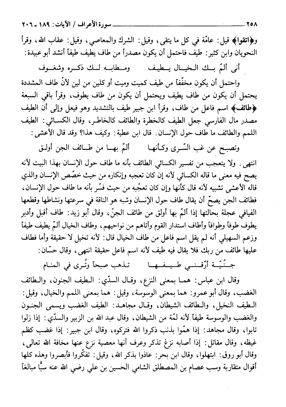 انْتَهَى. وَلَا يُتَعَجَّبُ مِنْ تَفْسِيرِ الْكِسَائِيِّ الطَّائِفَ بِأَنَّهُ مَا طَافَ حَوْلَ الْإِنْسَانِ بِهَذَا الْبَيْتِ لِأَنَّهُ يَصِحُّ فِيهِ مَعْنَى مَا قَالَهُ الْكِسَائِيُّ لِأَنَّهُ إِنْ كَانَ تَعَجُّبُهُ وَإِنْكَارُهُ مِنْ حَيْثُ خُصِّصَ الْإِنْسَانُ وَالَّذِي قَالَهُ الْأَعْشَى تَشْبِيهٌ لِأَنَّهُ قَالَ كَأَنَّهَا وَإِنْ كَانَ تَعَجُّبُهُ مِنْ حَيْثُ فَسَّرَ بِأَنَّهُ مَا طَافَ حَوْلَ الْإِنْسَانِ، فَطَائِفُ الْجِنِّ يَصِحُّ أَنْ يُقَالَ طَافَ حَوْلَ الْإِنْسَانِ وَشَبَّهَ هُوَ النَّاقَةَ فِي سُرْعَتِهَا وَنَشَاطِهَا وَقَطْعِهَا الْفَيَافِيَ عَجِلَةً بِحَالَتِهَا إِذَا أَلَمَّ بِهَا أَوْلَقَ مِنْ طَائِفِ الْجِنِّ، وَقَالَ أَبُو زَيْدٍ: طَافَ أَقْبَلَ وَأَدْبَرَ يَطُوفُ طَوْفًا وَطَوَافًا وَأَطَافَ اسْتَدَارَ الْقَوْمَ وَأَتَاهُمْ مِنْ نَوَاحِيهِمْ، وَطَافَ الْخَيَالُ أَلَمَّ يَطِيفُ طَيْفًا وَزَعَمَ السُّهَيْلِيُّ أَنَّهُ لَمْ يَقُلِ اسْمُ فَاعِلٍ مَنْ طَافَ الْخَيَالُ قَالَ: لِأَنَّهُ تَخَيُّلٌ لَا حَقِيقَةٌ وَأَمَّا فَطَافَ عَلَيْهَا طَائِفٌ مِنْ رَبِّكَ فَلَا يُقَالُ فِيهِ طَيْفٌ لِأَنَّهُ اسْمُ فَاعِلٍ حَقِيقَةً انْتَهَى، وَقَالَ حَسَّانُ: