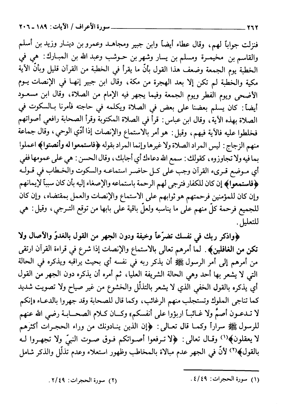 ، وَقَالَ عَطَاءٌ أَيْضًا وَابْنُ جُبَيْرٍ وَمُجَاهِدٌ وَعَمْرُو بْنُ دِينَارٍ وَزَيْدُ بْنُ أَسْلَمَ وَالْقَاسِمُ بْنُ مُخَيْمِرَةَ وَمُسْلِمُ بْنُ يَسَارٍ وَشَهْرُ بْنُ حَوْشَبٍ وَعَبْدُ اللَّهِ بْنُ الْمُبَارَكِ: هِيَ فِي الْخُطْبَةِ يَوْمَ الْجُمُعَةِ وَضَعُفَ هَذَا الْقَوْلِ بِأَنَّ مَا يُقْرَأُ فِي الْخُطْبَةِ مِنَ الْقُرْآنِ قَلِيلٌ وَبِأَنَّ الْآيَةَ مَكِّيَّةٌ وَالْخُطْبَةُ لَمْ تَكُنْ إِلَّا بَعْدَ الْهِجْرَةِ مِنْ مَكَّةَ، وَقَالَ ابْنُ جُبَيْرٍ إِنَّهَا فِي الْإِنْصَاتِ يَوْمَ الْأَضْحَى وَيَوْمَ الْفِطْرِ وَيَوْمَ الْجُمُعَةِ وَفِيمَا يَجْهَرُ فِيهِ الْإِمَامُ مِنَ الصَّلَاةِ، وَقَالَ ابْنُ مَسْعُودٍ أَيْضًا: كَانَ يُسَلِّمُ بَعْضُنَا عَلَى بَعْضٍ فِي الصَّلَاةِ وَيُكَلِّمُهُ فِي حَاجَتِهِ فَأُمِرْنَا بِالسُّكُوتِ فِي الصَّلَاةِ بِهَذِهِ الْآيَةِ، وَقَالَ ابْنُ عباس: قَرَأَ فِي الصَّلَاةِ الْمَكْتُوبَةِ وَقَرَأَ الصَّحَابَةُ رَافِعِي أَصْوَاتِهِمْ فَخَلَطُوا عَلَيْهِ فَالْآيَةُ فِيهِمْ، وَقِيلَ: هُوَ أَمْرٌ بِالِاسْتِمَاعِ والإنصات إذا أَدَّى الْوَحْيَ، وَقَالَ جَمَاعَةٌ مِنْهُمُ الزَّجَّاجُ: لَيْسَ الْمُرَادُ الصَّلَاةَ وَلَا غَيْرَهَا وَإِنَّمَا الْمُرَادُ بِقَوْلِهِ فَاسْتَمِعُوا لَهُ وَأَنْصِتُوا اعْمَلُوا بِمَا فِيهِ وَلَا تُجَاوِزُوهُ، كَقَوْلِكَ: سَمِعَ اللَّهُ دُعَاءَكَ أَيْ أَجَابَكَ، وَقَالَ الْحَسَنُ: هِيَ عَلَى عُمُومِهَا فَفِي أَيِّ مَوْضِعٍ قرىء الْقُرْآنُ وَجَبَ عَلَى كُلِّ حَاضِرٍ اسْتِمَاعُهُ وَالسُّكُوتُ وَالْخِطَابُ فِي قَوْلِهِ فَاسْتَمِعُوا إِنْ كَانَ لِلْكُفَّارِ فَتُرْجَى لَهُمُ الرَّحْمَةُ بِاسْتِمَاعِهِ وَالْإِصْغَاءِ إِلَيْهِ بِأَنْ كَانَ سَبَبًا لِإِيمَانِهِمْ وَإِنْ كَانَ لِلْمُؤْمِنِينَ فَرَحْمَتُهُمْ هُوَ ثَوَابُهُمْ عَلَى الِاسْتِمَاعِ وَالْإِنْصَاتِ وَالْعَمَلِ بِمُقْتَضَاهُ، وَإِنْ كَانَ لِلْجَمِيعِ فَرَحْمَةُ كُلٍّ مِنْهُمْ عَلَى مَا يُنَاسِبُهُ وَلَعَلَّ بَاقِيَةٌ عَلَى بَابِهَا مِنْ تَوَقُّعِ التَّرَجِّي، وَقِيلَ: هِيَ لِلتَّعْلِيلِ.