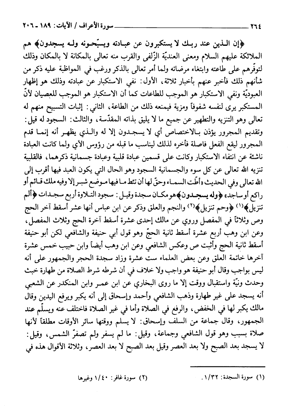 إِنَّ الَّذِينَ عِنْدَ رَبِّكَ لَا يَسْتَكْبِرُونَ عَنْ عِبادَتِهِ وَيُسَبِّحُونَهُ وَلَهُ يَسْجُدُونَ هُمُ الْمَلَائِكَةُ عَلَيْهِمُ السَّلَامُ وَمَعْنَى الْعِنْدِيَّةِ الزُّلْفَى وَالْقُرْبُ مِنْهُ تَعَالَى بِالْمَكَانَةِ لَا بِالْمَكَانِ وَذَلِكَ لِتَوَفُّرِهِمْ عَلَى طَاعَتِهِ وَابْتِغَاءِ مَرْضَاتِهِ وَلَمَّا أَمَرَ تَعَالَى بِالذِّكْرِ وَرَغَّبَ فِي الْمُوَاظَبَةِ عَلَيْهِ ذَكَرَ مِنْ شَأْنِهِمْ ذَلِكَ فَأَخْبَرَ عَنْهُمْ بِأَخْبَارٍ ثَلَاثَةٍ، الْأَوَّلُ: نَفْيُ الِاسْتِكْبَارِ عَنْ عِبَادَتِهِ وَذَلِكَ هُوَ إِظْهَارُ الْعُبُودِيَّةِ وَنَفْيُ الِاسْتِكْبَارِ هُوَ الْمُوجِبُ لِلطَّاعَاتِ كَمَا أَنَّ الِاسْتِكْبَارَ هُوَ الْمُوجِبُ لِلْعِصْيَانِ لِأَنَّ الْمُسْتَكْبِرَ يَرَى لِنَفْسِهِ شُفُوفًا وَمَزِيَّةً فَيَمْنَعُهُ ذَلِكَ مِنَ الطَّاعَةِ، الثَّانِي: إِثْبَاتُ التَّسْبِيحِ مِنْهُمْ لَهُ تَعَالَى وَهُوَ التَّنْزِيهُ وَالتَّطْهِيرُ عَنْ جَمِيعِ مَا لَا يَلِيقُ بِذَاتِهِ الْمُقَدَّسَةِ، وَالثَّالِثُ: السُّجُودُ لَهُ قِيلَ: