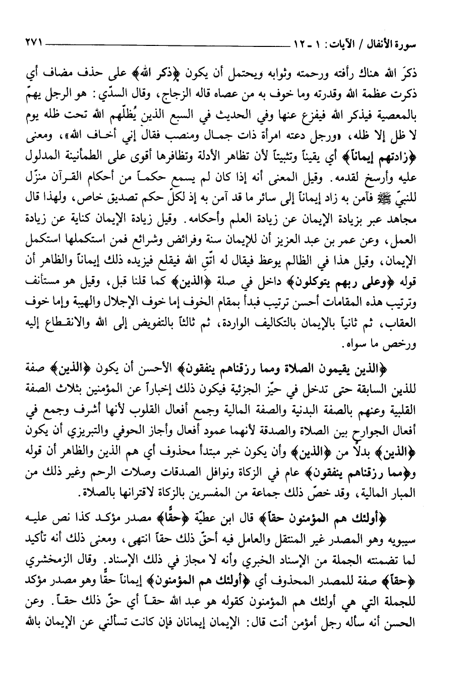 ، وَمَعْنَى زادَتْهُمْ إِيماناً أَيْ يَقِينًا وَتَثْبِيتًا لِأَنَّ تَظَاهُرَ الْأَدِلَّةِ وَتَظَافُرَهَا أَقْوَى عَلَى الطُّمَأْنِينَةِ الْمَدْلُولِ عَلَيْهِ وَأَرْسَخُ لِقَدَمِهِ. وَقِيلَ الْمَعْنَى أَنَّهُ إِذَا كَانَ لَمْ يَسْمَعْ حُكْمًا مِنْ أَحْكَامِ الْقُرْآنِ مُنَزَّلٌ لِلنَّبِيِّ صَلَّى اللَّهُ عَلَيْهِ وَسَلَّمَ فَآمَنَ بِهِ زَادَ إِيمَانًا إِلَى سَائِرِ مَا قَدْ آمَنَ بِهِ إِذْ لِكُلِّ حُكْمٍ تَصْدِيقٌ خَاصٌّ، وَلِهَذَا قَالَ مُجَاهِدٌ عَبَّرَ بِزِيَادَةِ الْإِيمَانِ عَنْ زِيَادَةِ الْعِلْمِ وَأَحْكَامِهِ. وَقِيلَ زِيَادَةُ الْإِيمَانِ كِنَايَةٌ عَنْ زِيَادَةِ الْعَمَلِ، وَعَنْ عُمَرَ بْنِ عَبْدِ الْعَزِيزِ أَنَّ لِلْإِيمَانِ سُنَّةً وَفَرَائِضَ وَشَرَائِعَ فَمَنِ اسْتَكْمَلَهَا اسْتَكْمَلَ الْإِيمَانَ، وَقِيلَ هَذَا فِي الظَّالِمِ يُوعَظُ فَيُقَالُ لَهُ اتَّقِ اللَّهَ فَيُقْلِعُ فَيَزِيدُهُ ذَلِكَ إيمانا والظهر أَنَّ قَوْلَهُ وَعَلى رَبِّهِمْ يَتَوَكَّلُونَ دَاخِلٌ فِي صِلَةِ الَّذِينَ كَمَا قُلْنَا قَبْلُ، وَقِيلَ هُوَ مُسْتَأْنَفٌ وَتَرْتِيبُ هَذِهِ الْمَقَامَاتِ أَحْسَنُ تَرْتِيبٍ فَبَدَأَ بِمَقَامِ الْخَوْفِ إِمَّا خَوْفُ الْإِجْلَالِ وَالْهَيْبَةِ وَإِمَّا خَوْفُ الْعِقَابِ، ثُمَّ ثَانِيًا بِالْإِيمَانِ بِالتَّكَالِيفِ الْوَارِدَةِ، ثُمَّ ثَالِثًا بِالتَّفْوِيضِ إِلَى اللَّهِ وَالِانْقِطَاعِ إِلَيْهِ وَرُخْصِ مَا سِوَاهُ.