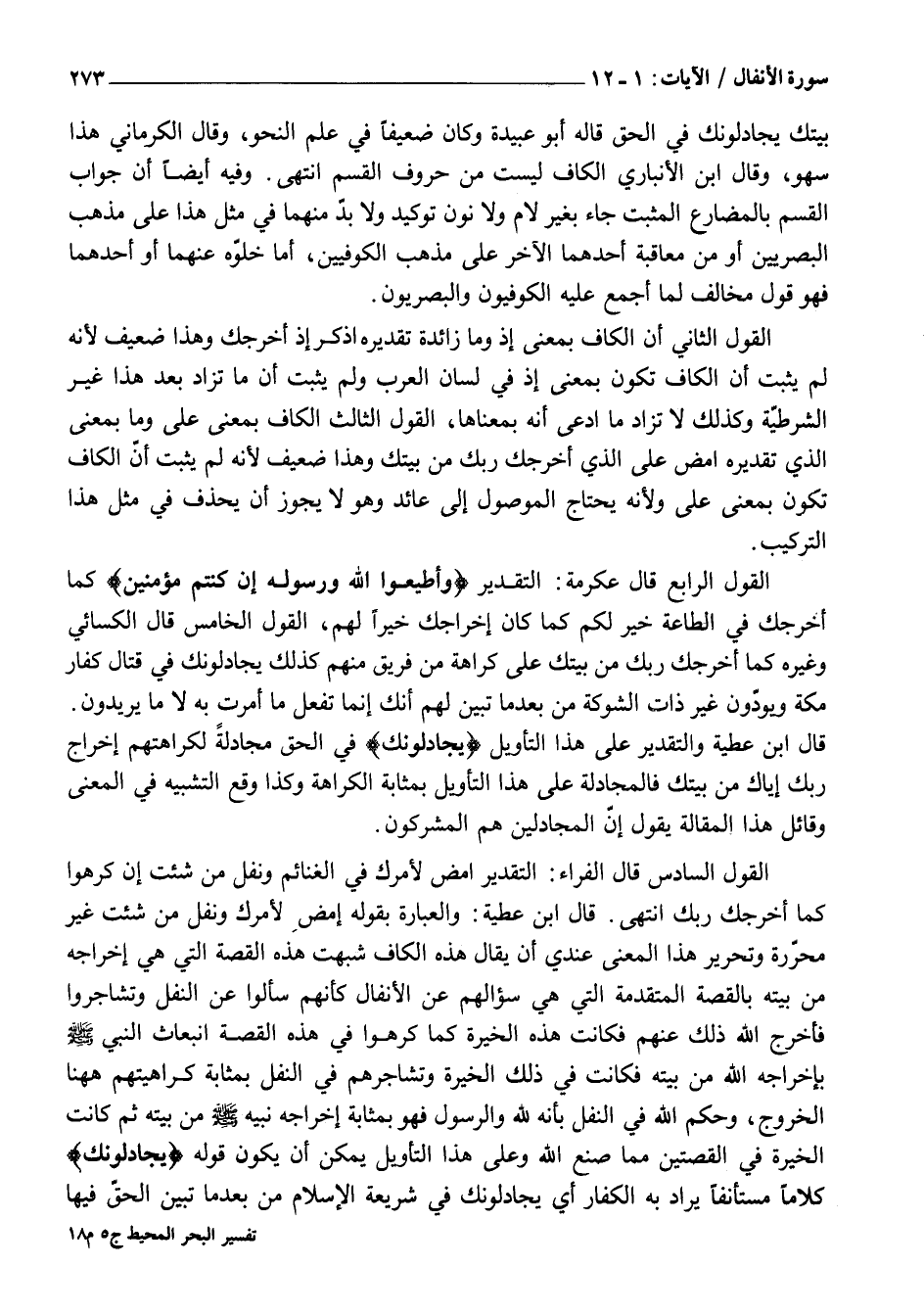 الْقَوْلُ الرَّابِعُ قَالَ عِكْرِمَةُ: التَّقْدِيرُ وَأَطِيعُوا اللَّهَ وَرَسُولَهُ إِنْ كُنْتُمْ مُؤْمِنِينَ كَمَا أَخْرَجَكَ فِي الطَّاعَةِ خَيْرٌ لَكُمْ كَمَا كَانَ إِخْرَاجُكَ خَيْرًا لَهُمُ، الْقَوْلُ الْخَامِسُ قَالَ الْكِسَائِيُّ وَغَيْرُهُ كَمَا أَخْرَجَكَ رَبُّكَ مِنْ بَيْتِكَ عَلَى كَرَاهَةٍ مِنْ فَرِيقٍ مِنْهُمْ كَذَلِكَ يُجَادِلُونَكَ فِي قِتَالِ كُفَّارِ مَكَّةَ وَيَوَدُّونَ غَيْرَ ذَاتِ الشَّوْكَةِ مِنْ بَعْدِ مَا تَبَيَّنَ لَهُمْ أَنَّكَ إِنَّمَا تَفْعَلُ مَا أُمِرْتَ بِهِ لَا مَا يُرِيدُونَ.