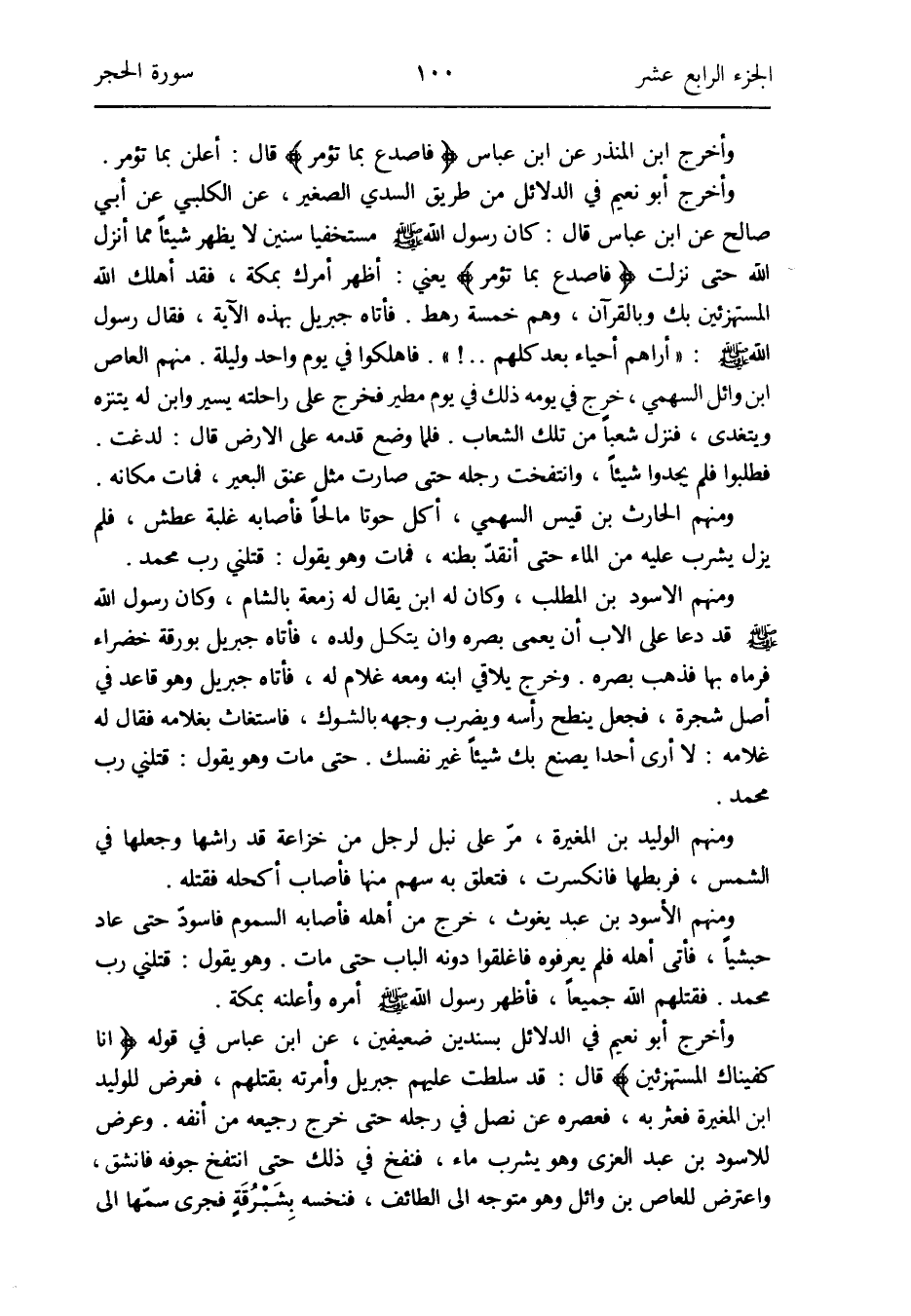 وَأخرج أَبُو نعيم فِي الدَّلَائِل بِسَنَدَيْنِ ضعيفين عَن ابْن عَبَّاس فِي قَوْله: {إِنَّا كَفَيْنَاك الْمُسْتَهْزِئِينَ} قَالَ: قد سلط عَلَيْهِم جِبْرِيل وأمرته بقيلهم فَعرض للوليد بن الْمُغيرَة فعثر بِهِ فعصره عَن نصل فِي رجله حَتَّى خرج رجيعه من أَنفه