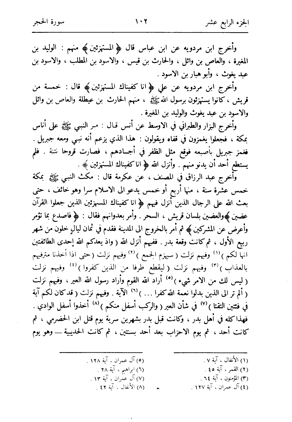 وَفِيهِمْ نزلت (قد كَانَ لكم آيَة فِي فئتين التقتا) (آل عمرَان أَيَّة 13) فِي شَأْن العير (والركب أَسْفَل مِنْكُم) (الْأَنْفَال آيَة 42) أخذُوا أَسْفَل الْوَادي