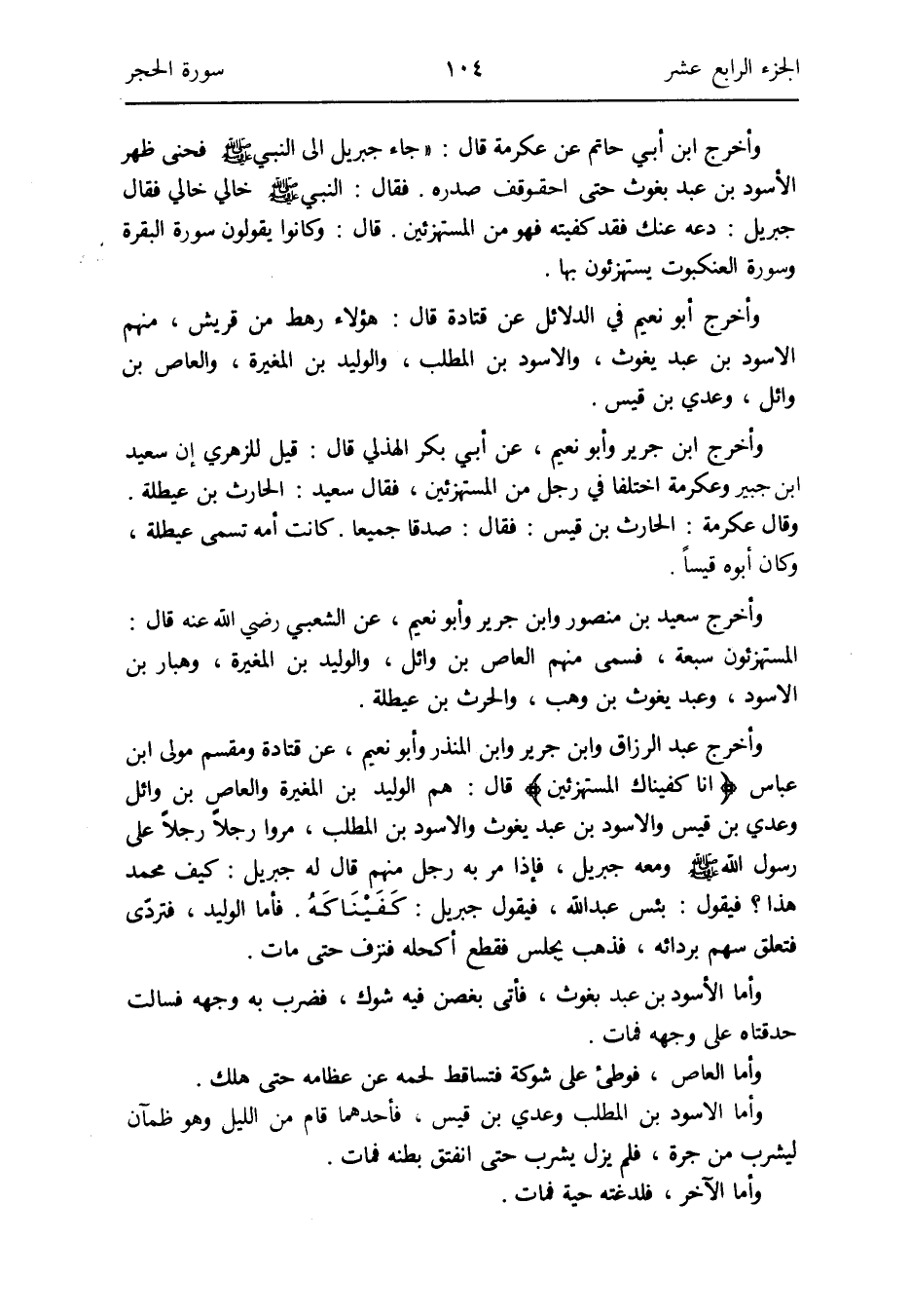 وَأخرج أَبُو نعيم فِي الدَّلَائِل عَن قَتَادَة قَالَ: هَؤُلَاءِ رَهْط من قُرَيْش مِنْهُم الْأسود بن عبد يَغُوث وَالْأسود بن الْمطلب والوليد بن الْمُغيرَة وَالْعَاص بن وَائِل وعدي بن قيس
