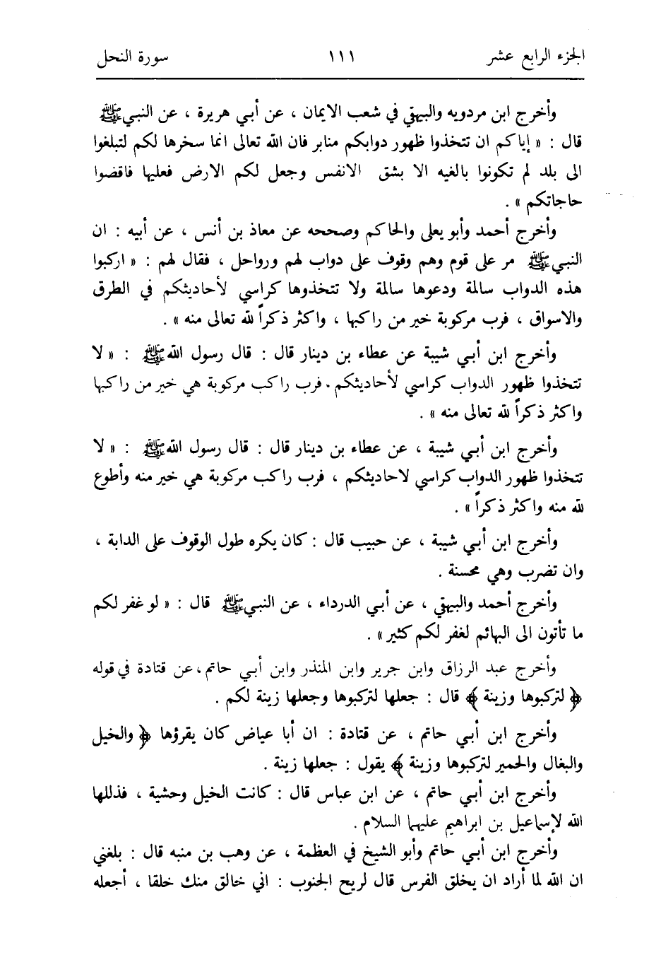 وَأخرج ابْن مرْدَوَيْه وَالْبَيْهَقِيّ فِي شعب الإِيمان عَن أبي هُرَيْرَة عَن النَّبِي صلى الله عَلَيْهِ وَسلم قَالَ: إيَّاكُمْ أَن تَتَّخِذُوا ظُهُور دوابكم مَنَابِر فَإِن الله تَعَالَى إِنَّمَا سخرها لكم لتبلغوا إِلَى بلد لم تَكُونُوا بالغيه إِلَّا بشق الْأَنْفس وَجعل لكم الأَرْض فعلَيْهَا فاقضوا حاجاتكم