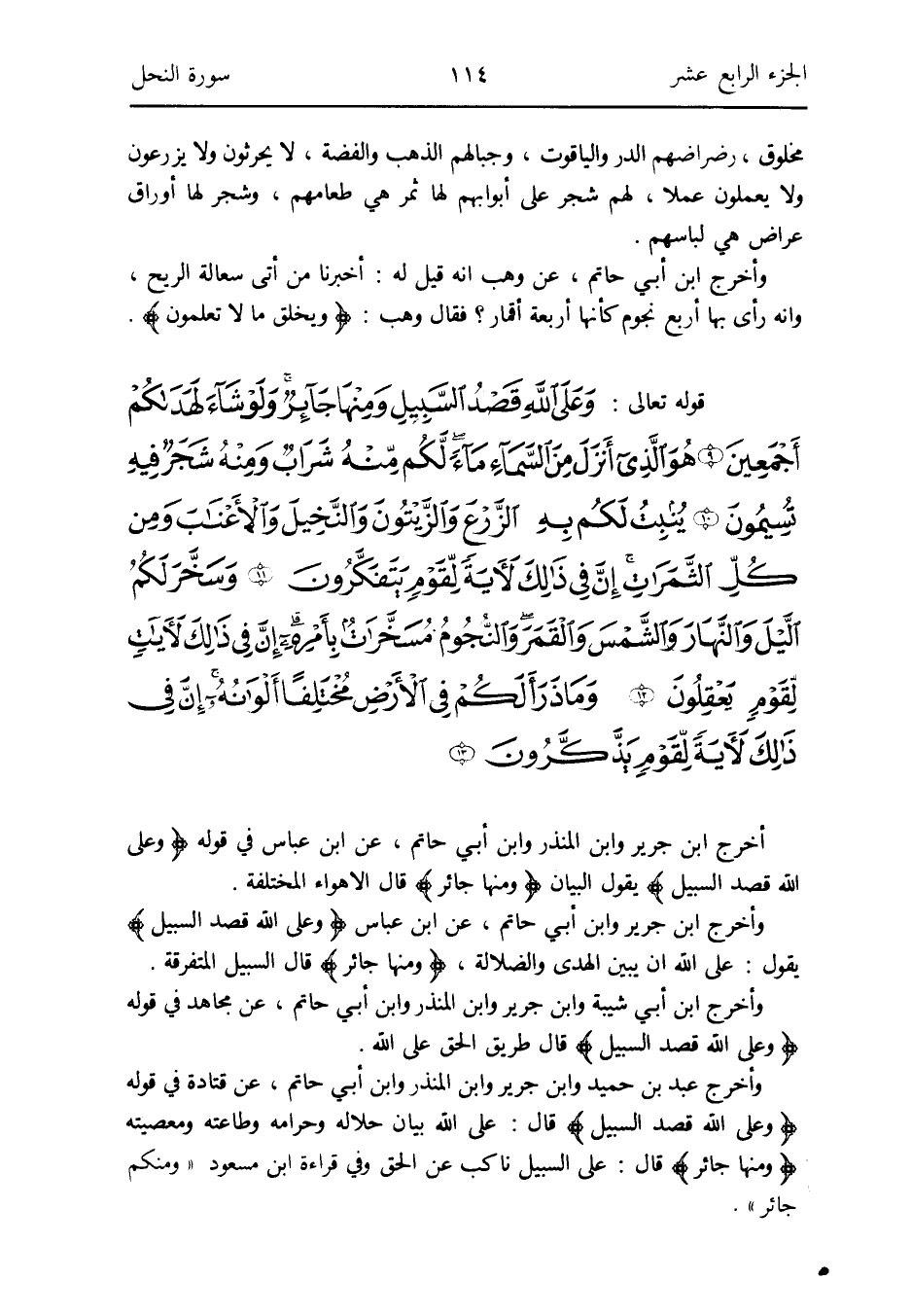 وَأخرج ابْن جرير وَابْن أبي حَاتِم عَن ابْن عَبَّاس {وعَلى الله قصد السَّبِيل} يَقُول: على الله أَن يبين الْهدى والضلالة {وَمِنْهَا جَائِر} قَالَ السَّبِيل المتفرقة