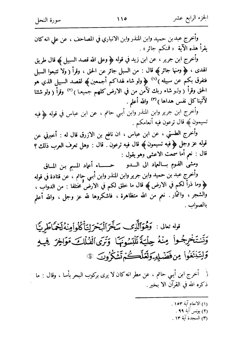 وَأخرج ابْن جرير عَن ابْن زيد فِي قَوْله: {وعَلى الله قصد السَّبِيل} قَالَ: طَرِيق الْهدى {وَمِنْهَا جَائِر} قَالَ: من السبل جَائِر عَن الْحق وَقَرَأَ (وَلَا تتبعوا السبل فتقرق بكم عَن سَبيله) (الْأَنْعَام آيَة 153) {وَلَو شَاءَ لهداكم أَجْمَعِينَ} لقصد السَّبِيل الَّذِي هُوَ الْحق وَقَرَأَ (وَلَو شَاءَ رَبك لأمن من فِي الأَرْض كلهم جَمِيعًا) (يُونُس آيَة 99) وَقَرَأَ (وَلَو شِئْنَا لآتينا كل نفس هداها) (السَّجْدَة آيَة 13) وَالله أعلم
