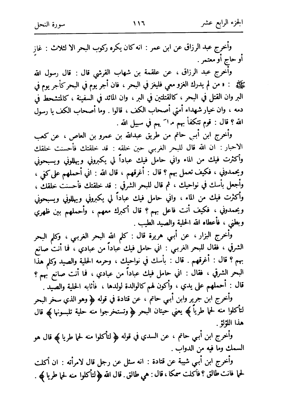 وَأخرج ابْن جرير وَابْن أبي حَاتِم عَن قَتَادَة فِي قَوْله: {وَهُوَ الَّذِي سخر الْبَحْر لتأكلوا مِنْهُ لَحْمًا طرياً} يَعْنِي حيتان الْبَحْر {وتستخرجوا مِنْهُ حلية تلبسونها} قَالَ: هَذَا اللُّؤْلُؤ