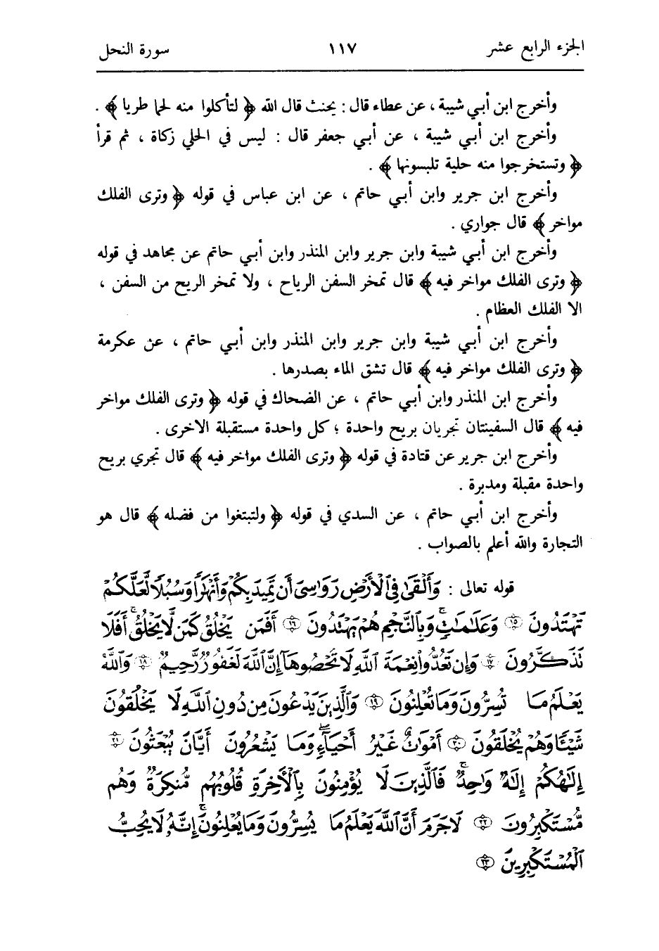 وَأخرج ابْن أبي شيبَة وَابْن جرير وَابْن الْمُنْذر وَابْن أبي حَاتِم عَن عِكْرِمَة {وَترى الْفلك مواخر فِيهِ} قَالَ: تشق المَاء بصدرها