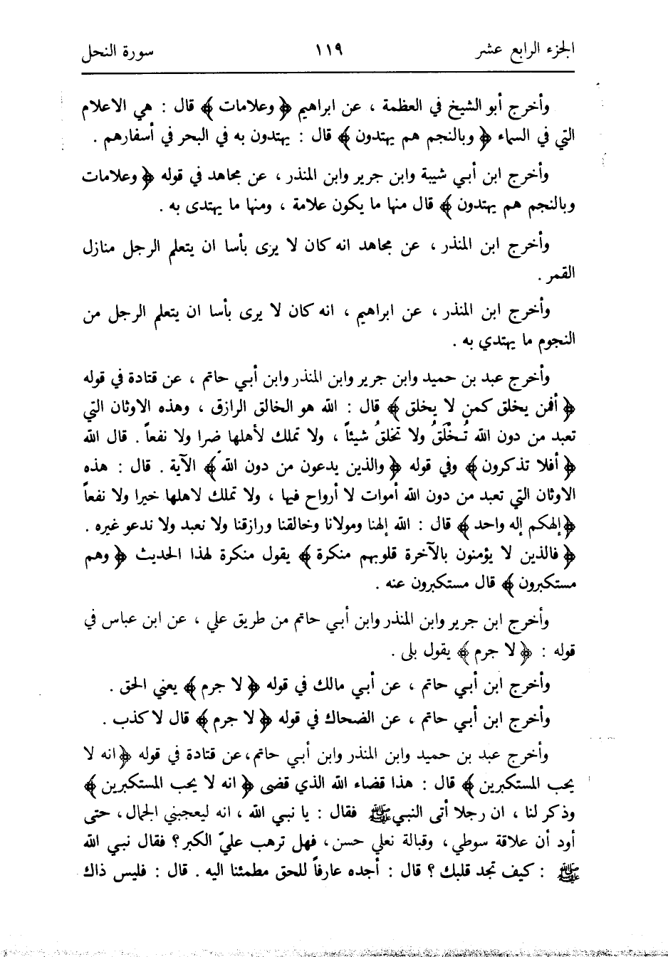 وَأخرج أَبُو الشَّيْخ فِي العظمة عَن إِبْرَاهِيم {وعلامات} قَالَ: هِيَ الاعلام الَّتِي فِي السَّمَاء {وبالنجم هم يَهْتَدُونَ} قَالَ: يَهْتَدُونَ بِهِ فِي الْبَحْر فِي أسفارهم