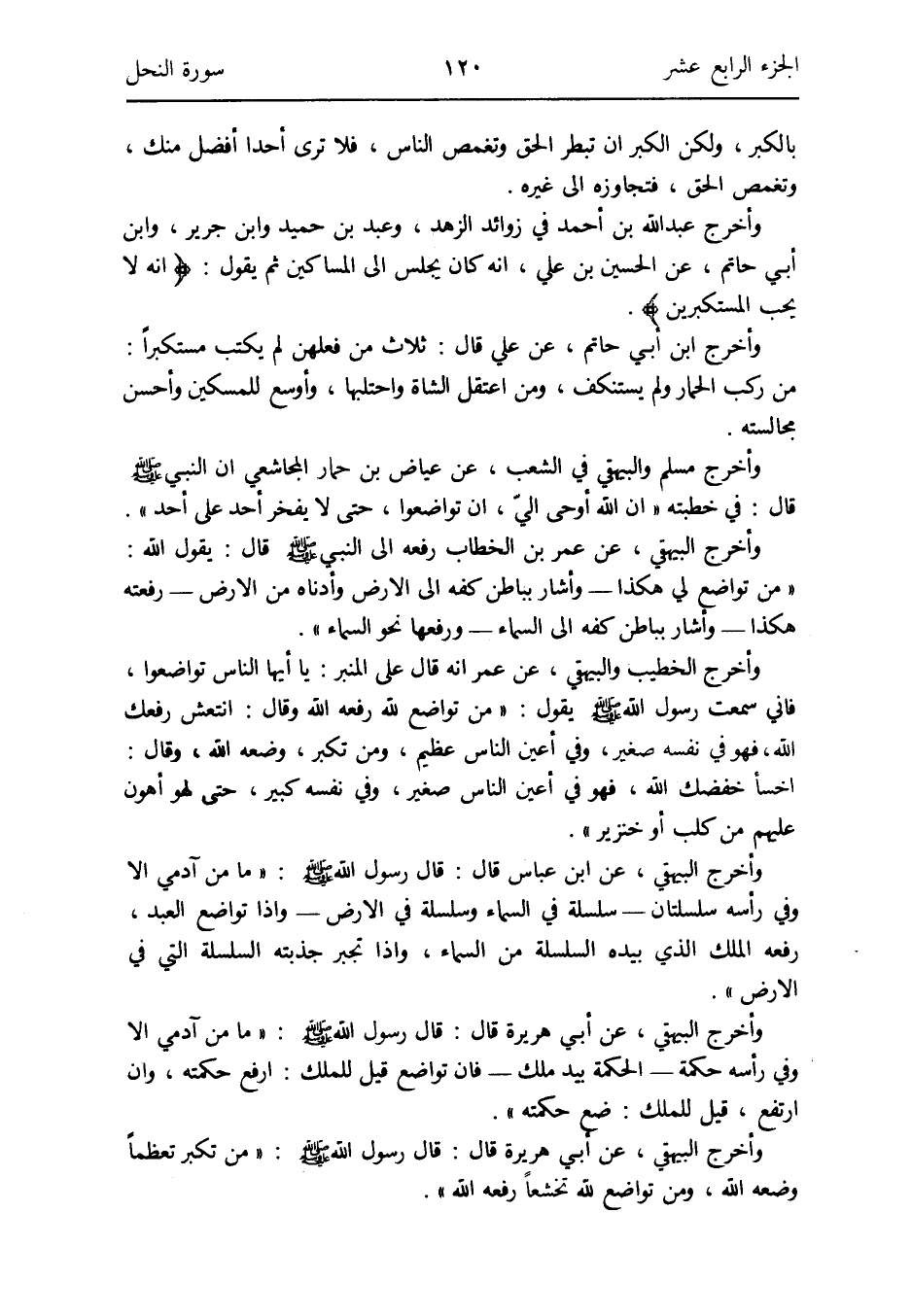 وَأخرج الْبَيْهَقِيّ عَن ابْن عَبَّاس قَالَ: قَالَ رَسُول الله صلى الله عَلَيْهِ وَسلم: مَا من آدَمِيّ إِلَّا وَفِي رَأسه سلسلتان - سلسلة فِي السَّمَاء وسلسلة فِي الأَرْض - وَإِذا تواضع العَبْد رَفعه الْملك الَّذِي بِيَدِهِ السلسلة من السَّمَاء وَإِذا تجبر جذبته السلسلة الَّتِي فِي الأَرْض