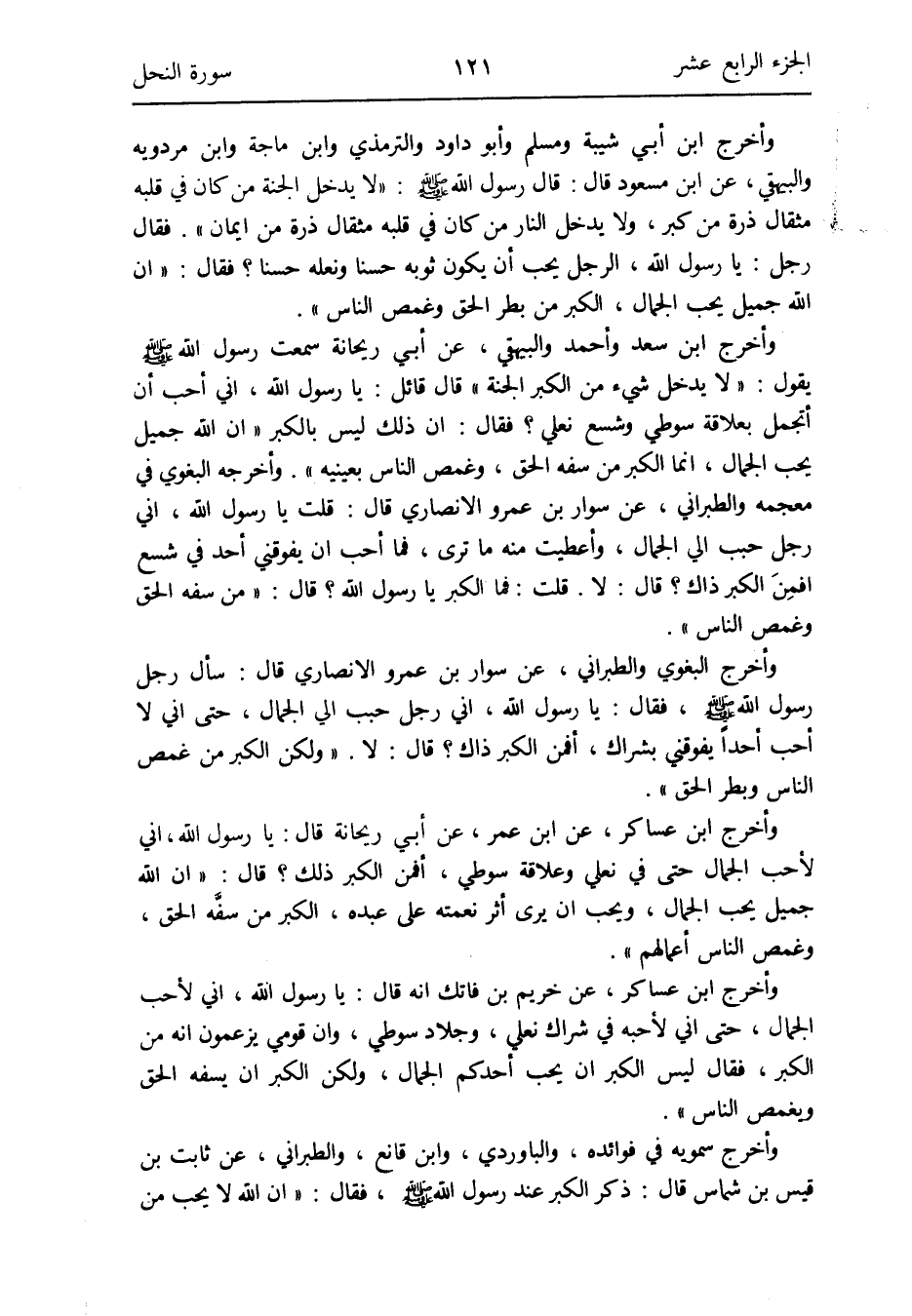 وَأخرج ابْن عَسَاكِر عَن ابْن عمر عَن أبي رَيْحَانَة قَالَ: يَا رَسُول الله إِنِّي لأحب الْجمال حَتَّى فِي نَعْلي وعلاقة سَوْطِي أَفَمَن الْكبر ذَلِك قَالَ: إِن الله جميل يحب الْجمال وَيُحب أَن يرى أثر نعْمَته على عَبده الْكبر من سفه الْحق وَغَمص النَّاس أَعْمَالهم